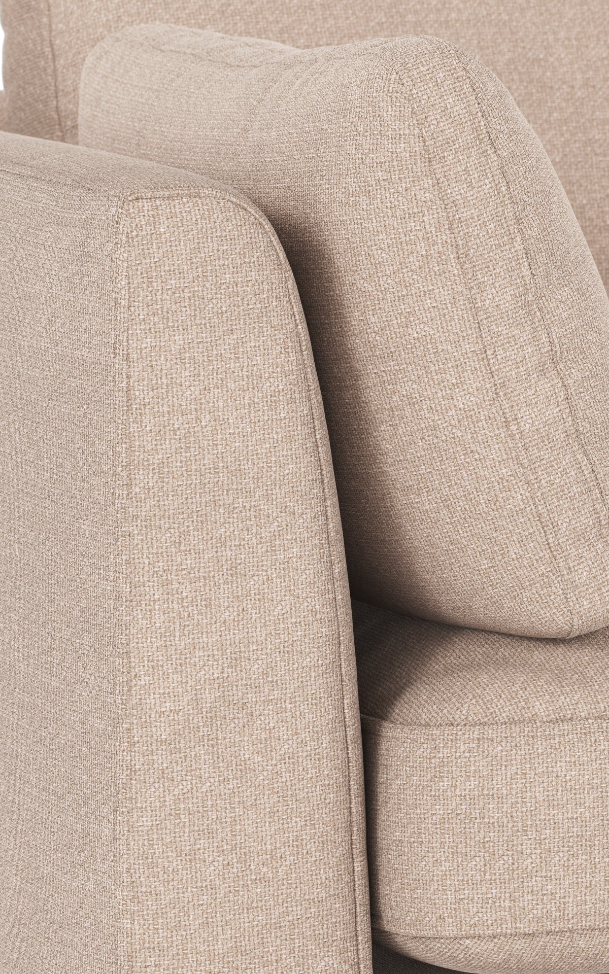 • Beige stoppad soffa med mjuka kuddar och textilklädsel i närbild