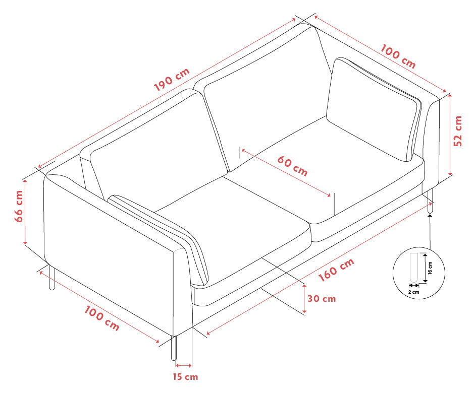 • Måttskiss för fåtölj med dimensioner: 100 cm bredd, 190 cm djup, 66 cm höjd, sits 60 cm, ryggstöd 52 cm