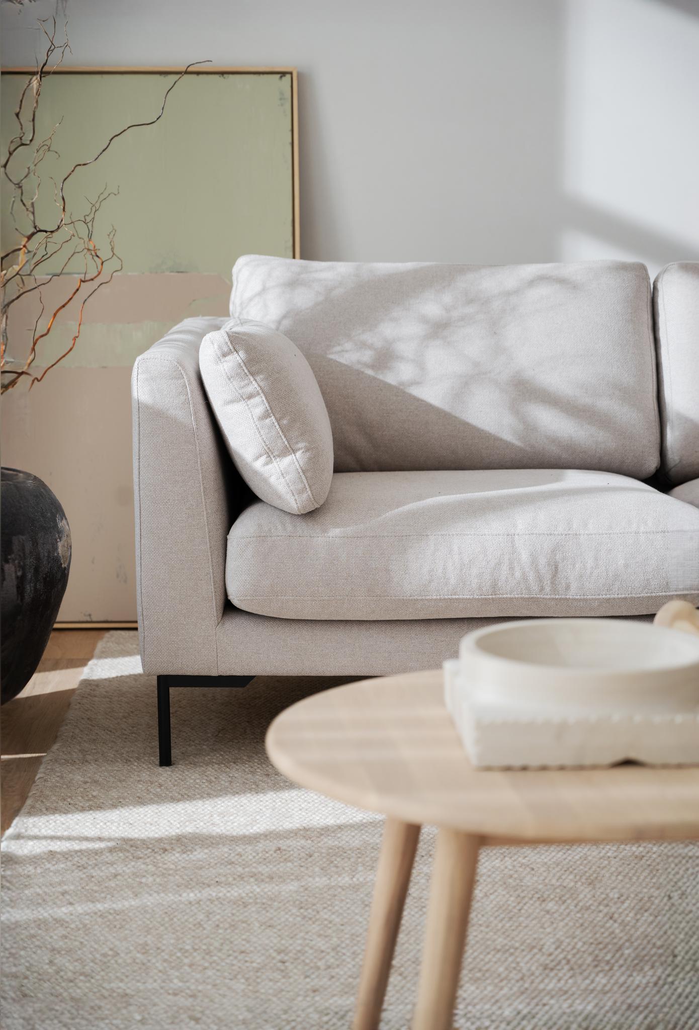• Beige soffa med loose fit-klädsel och svarta metallben på grå matta mot ljus vägg