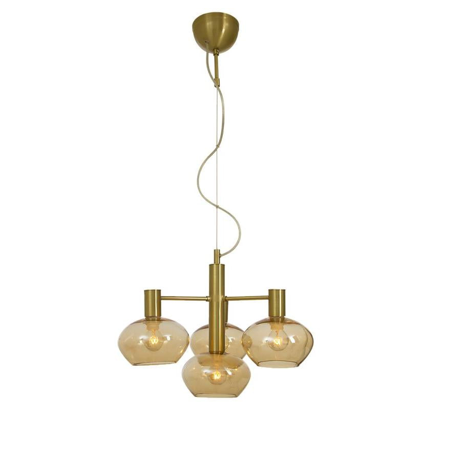 • Taklampa med fyra ljuskällor i rökfärgat glas och mässingsfäste, modern pendellampa