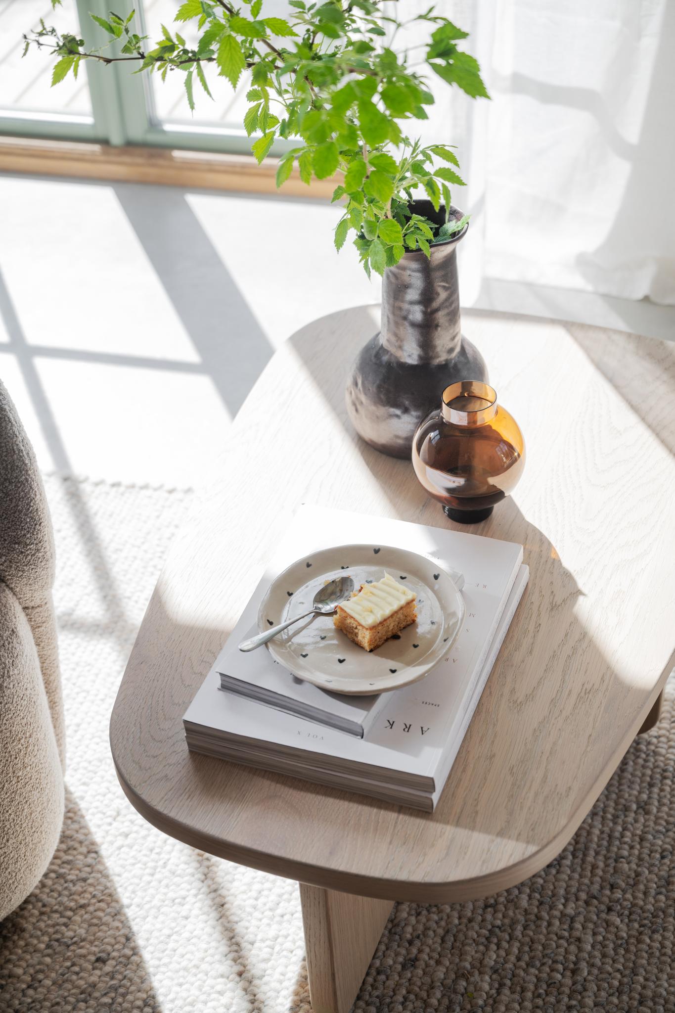 • Ljust vardagsrum med träsoffbord, keramikvas med gröna växter, bärnstensfärgad glasvas och tårta på fat