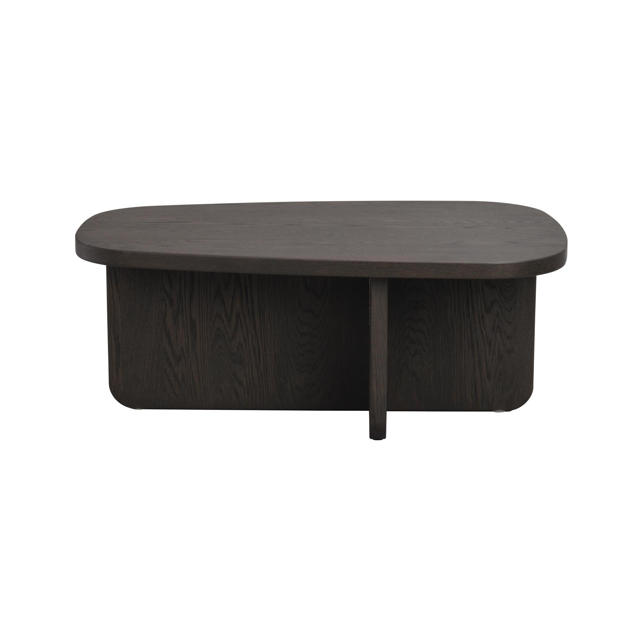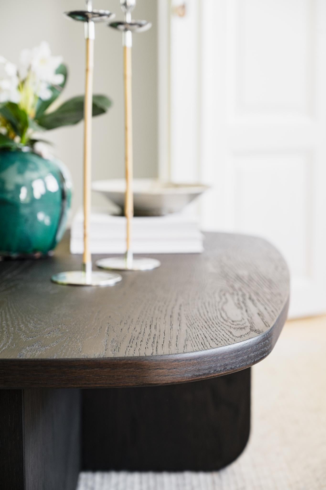 • Ovalt soffbord i mörkbetsad ek med rundade kanter och massiv fotplatta i modern skandinavisk design