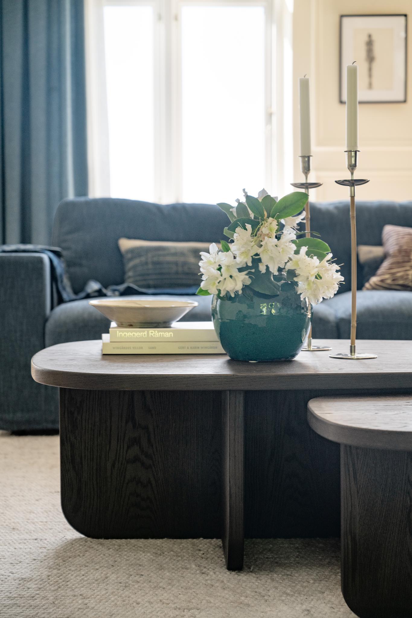 • Soffbord i mörkt trä med vas, ljusstakar och bok i modernt vardagsrum med blå soffa