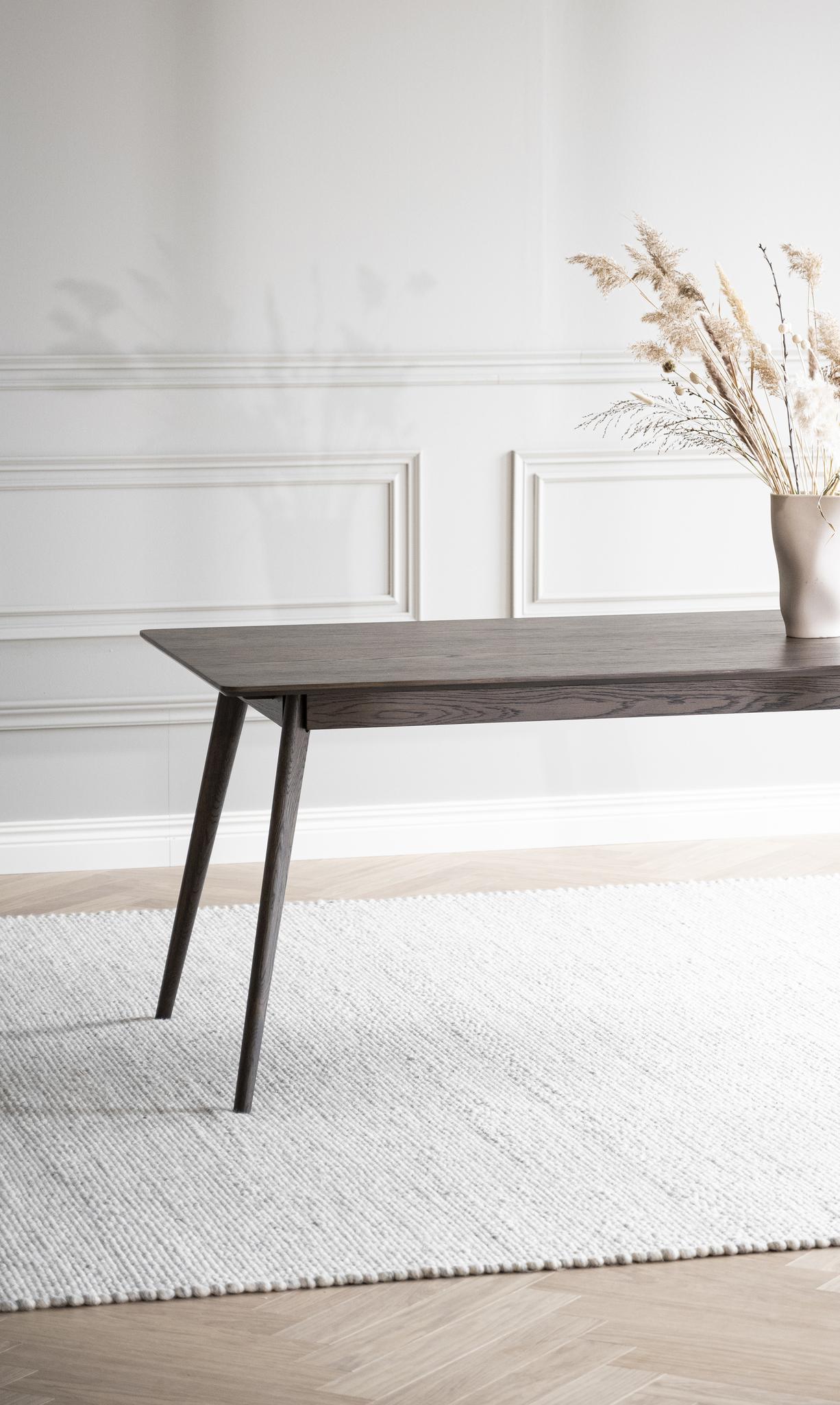 • Mörkbrun träbord med sneda ben på vit vävd matta framför vit vägg med tavellist och vas med torkade gräs