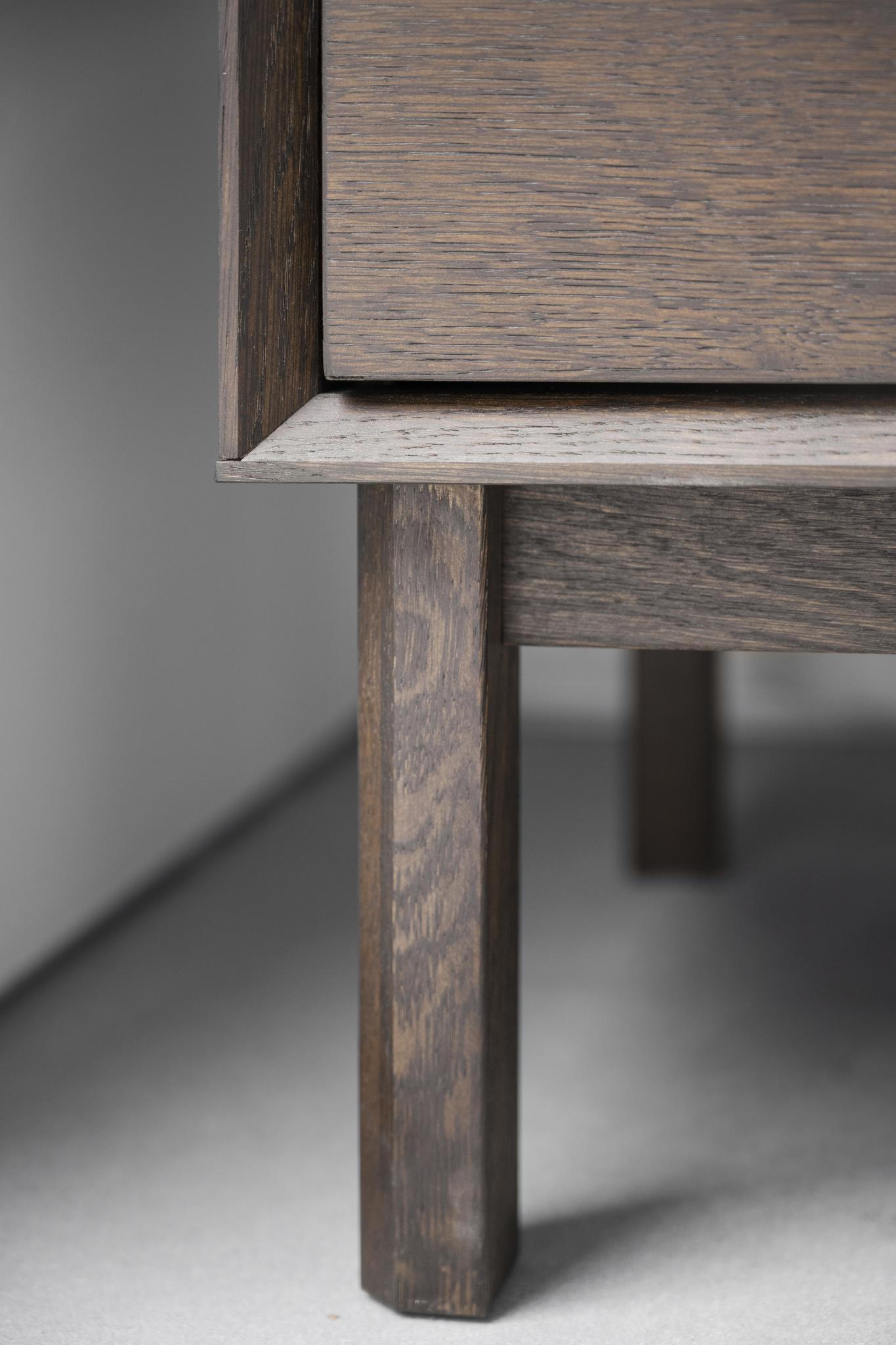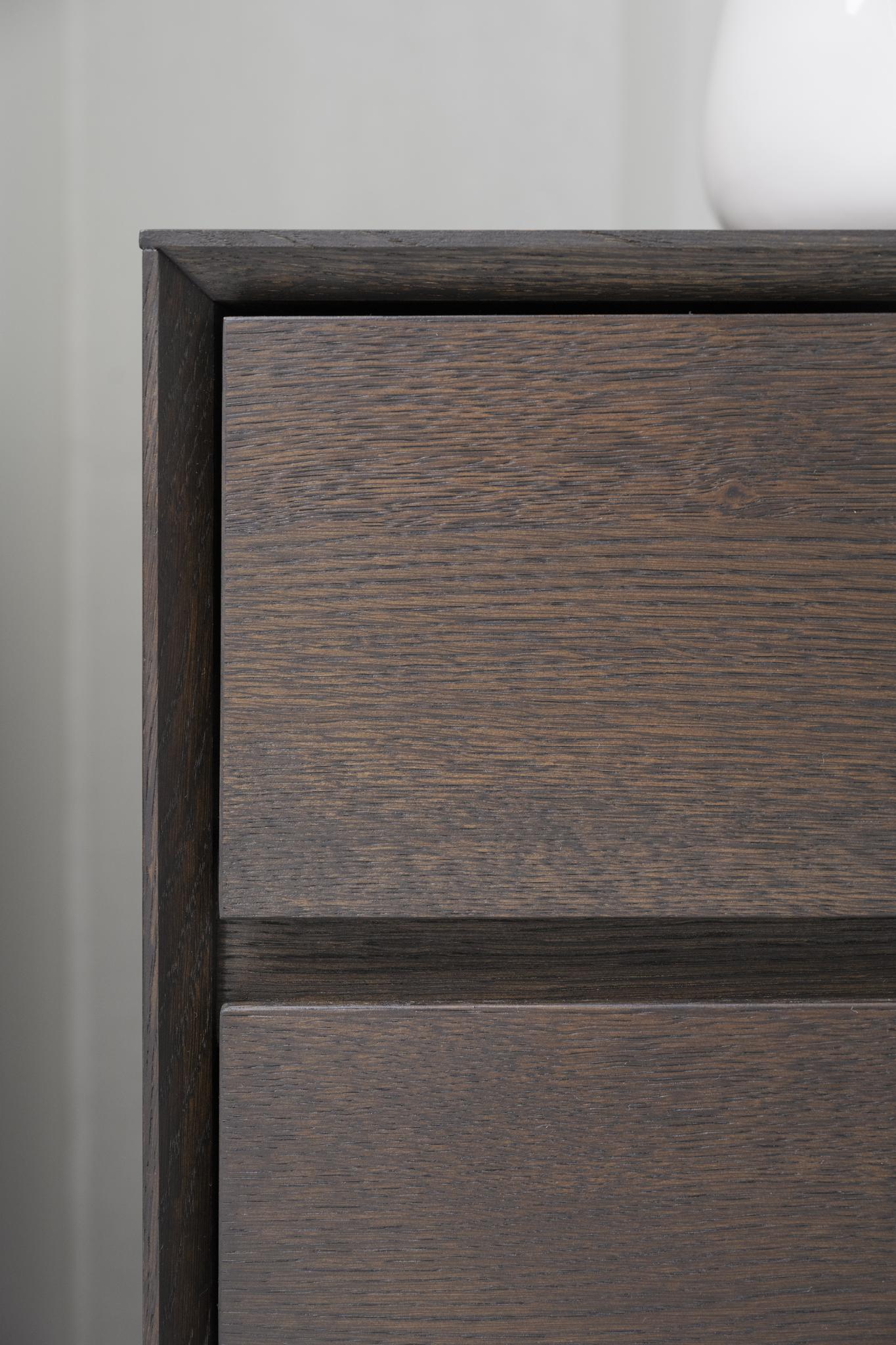 • Närbild på möbelhörn i mörkt trä med synlig trästruktur och snygga skarvar mellan lådor