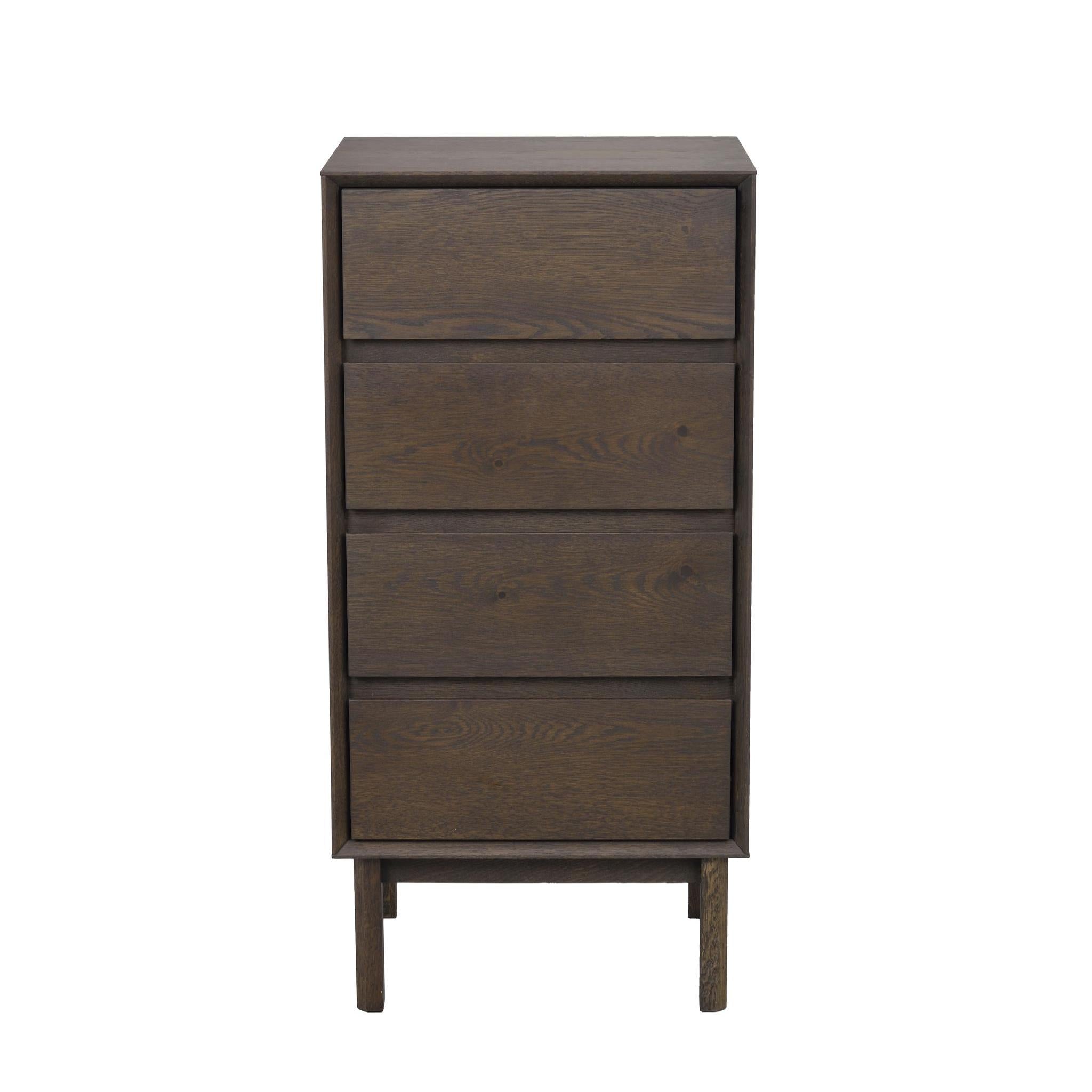 Byrån Mackay i brun vildek med 4 lådor är ett gediget hantverk med girade hörn och en inramning runt lådorna som skapar ett djup och ett härligt skuggspel på möbeln. Byrån har en klassisk design med sina raka linjer, vilket gör den hållbar över tid. Passar lika bra i hallen som i sovrummet. Vildeken som byrån är tillverkad i bidrar till en intressant karaktär i möbelns yta. Mackay finns i tre olika storlekar. Trät i byrån är FSC®-certifierat och finns i alternativen oljad vildek och brunojad vildek.