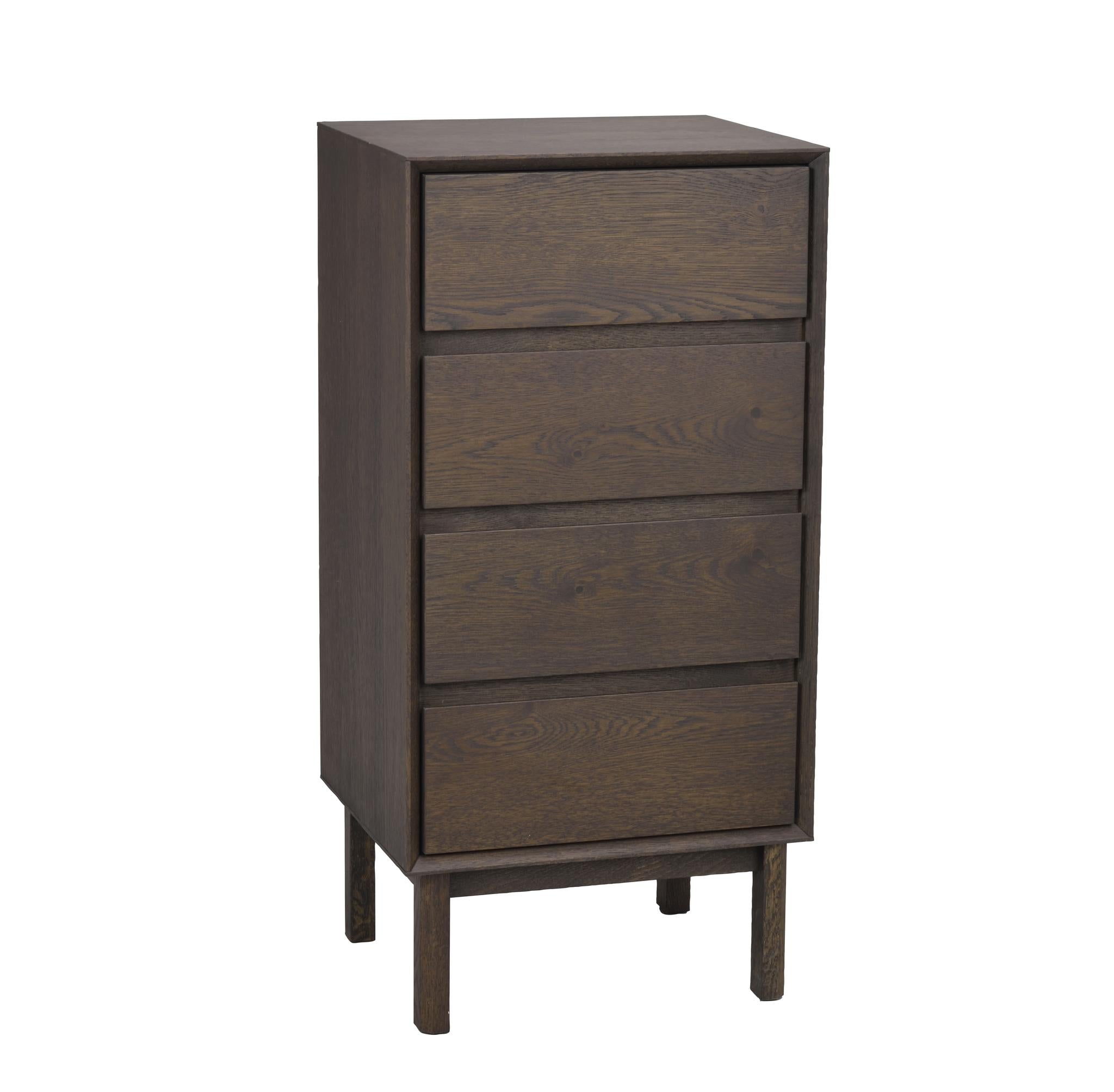 • Brun byrå med fyra lådor i mörkt trä på smala ben, modern skandinavisk design