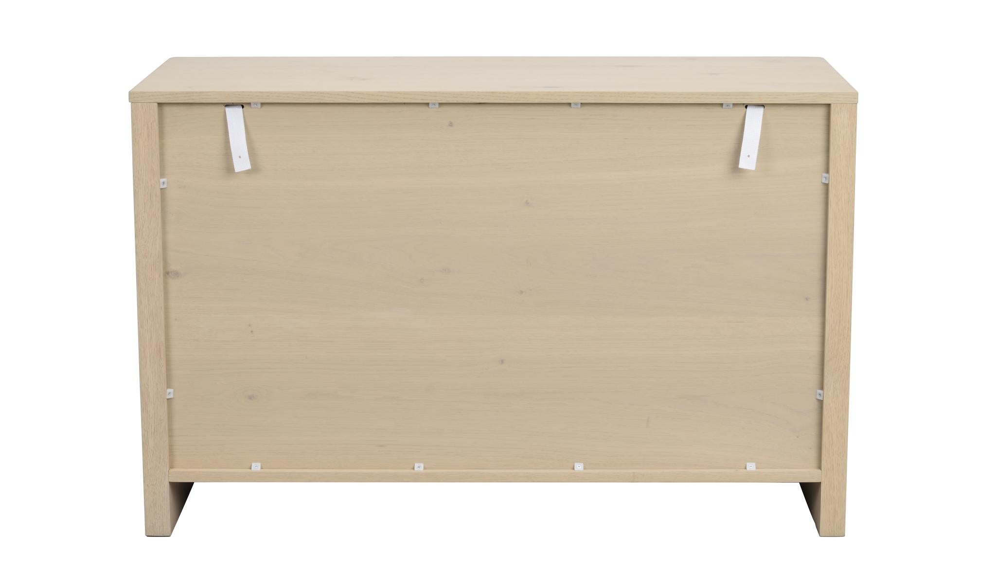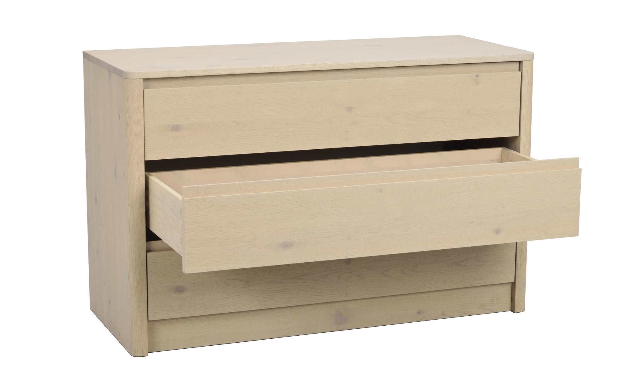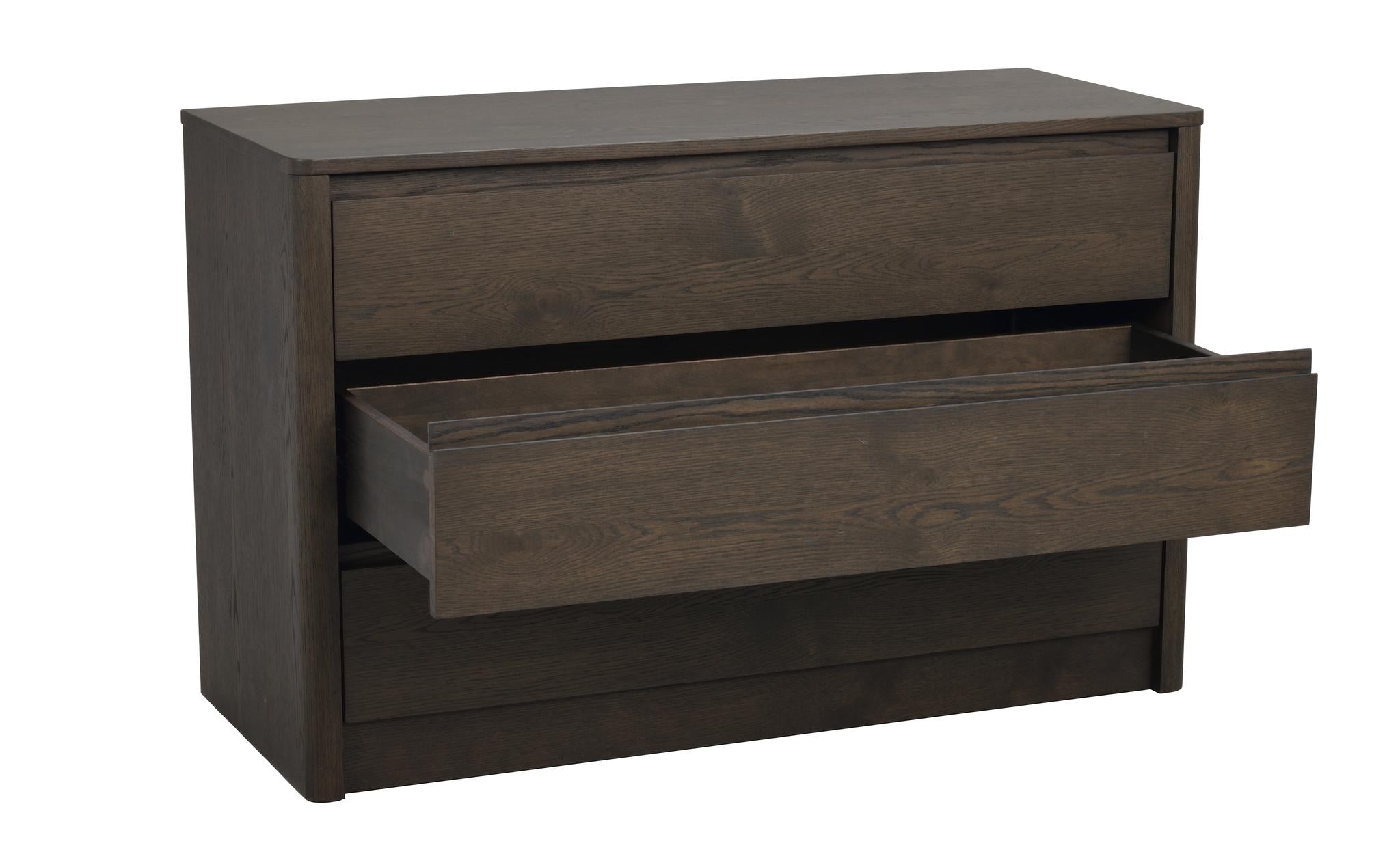 Stomme och lådor i spånskiva med ekfanér. Lådfronternas överkant i massiv ek, gavlars rundning i massiv ek. Rygg i MDF med ekfaner.