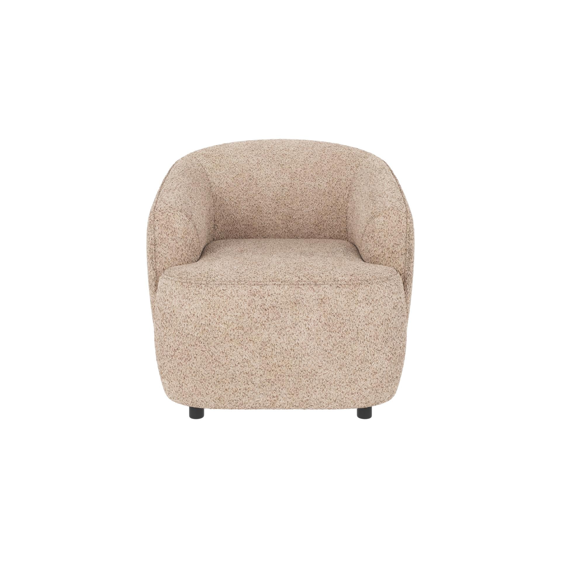 • Beige fåtölj i bouclé-tyg med rundade former och svarta träben