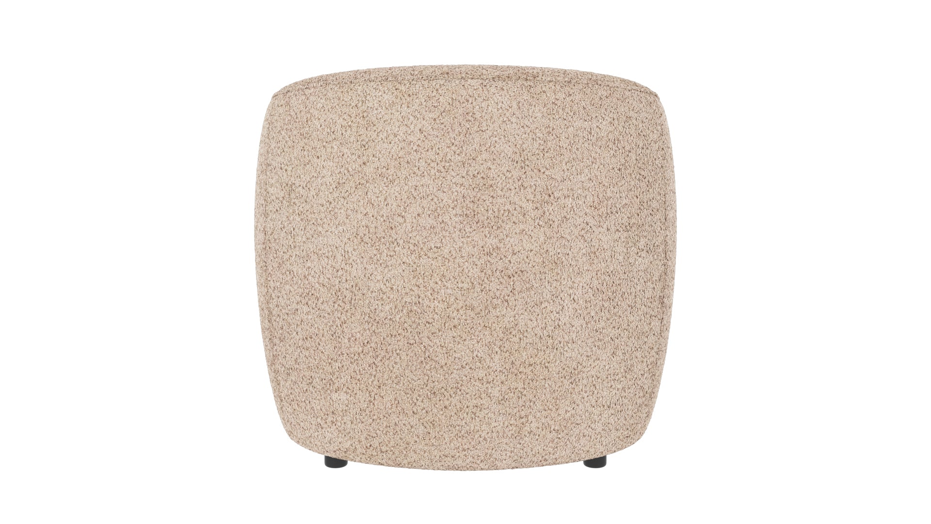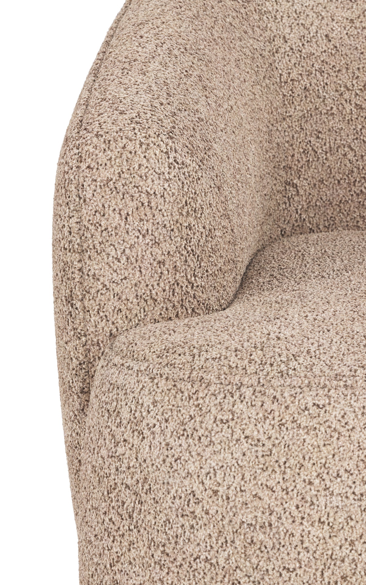 • Närbild på beige bouclé fåtölj med mjuk, texturerad klädsel och rundad armstöd