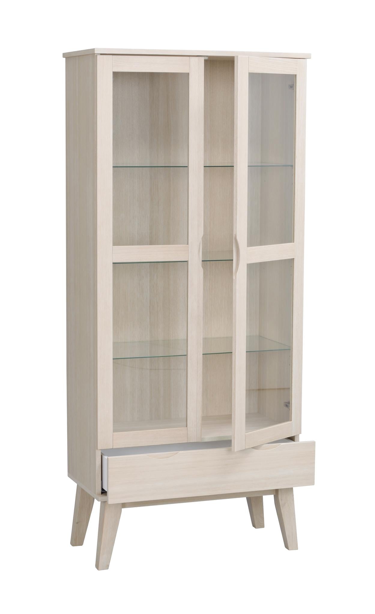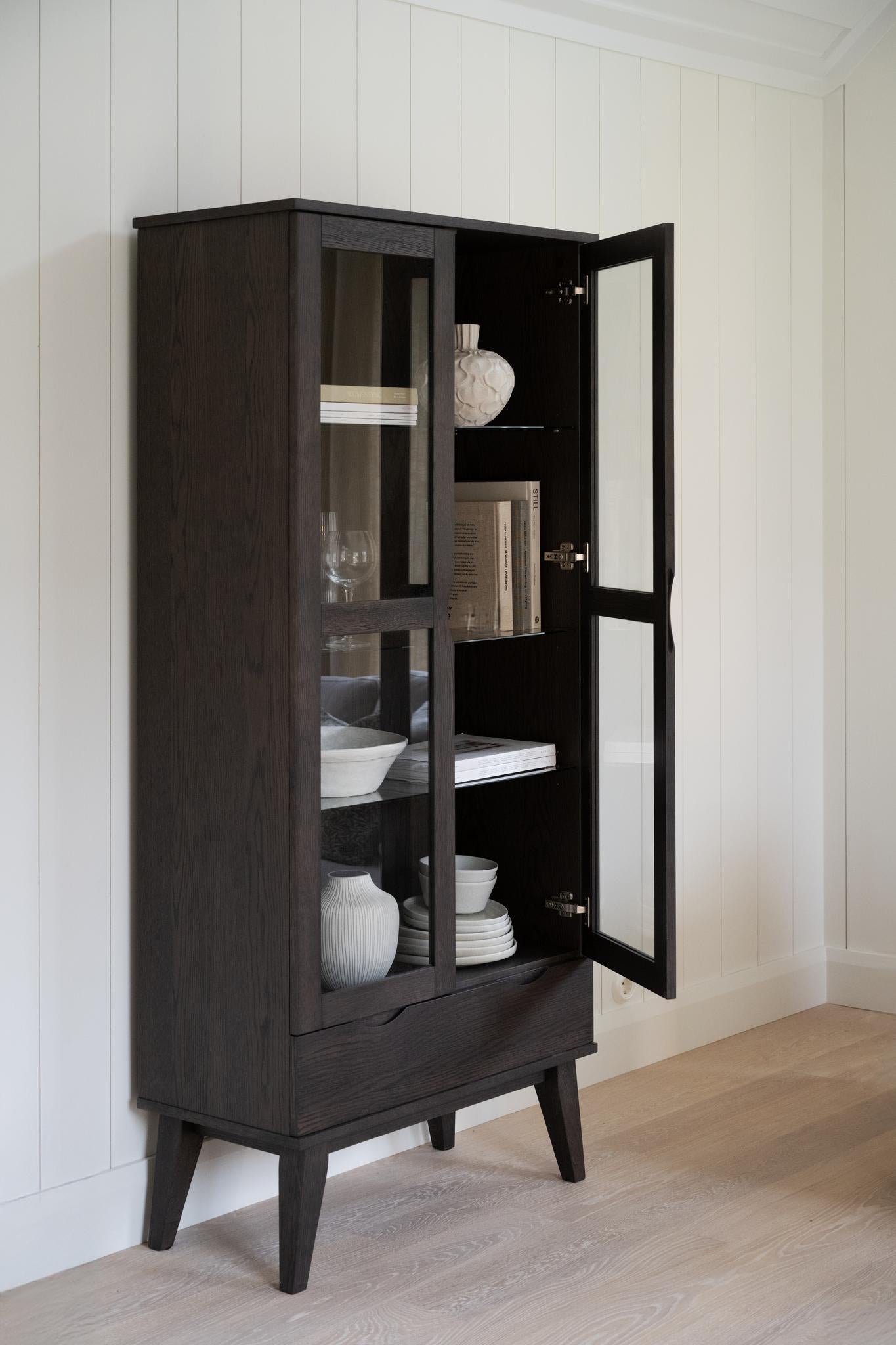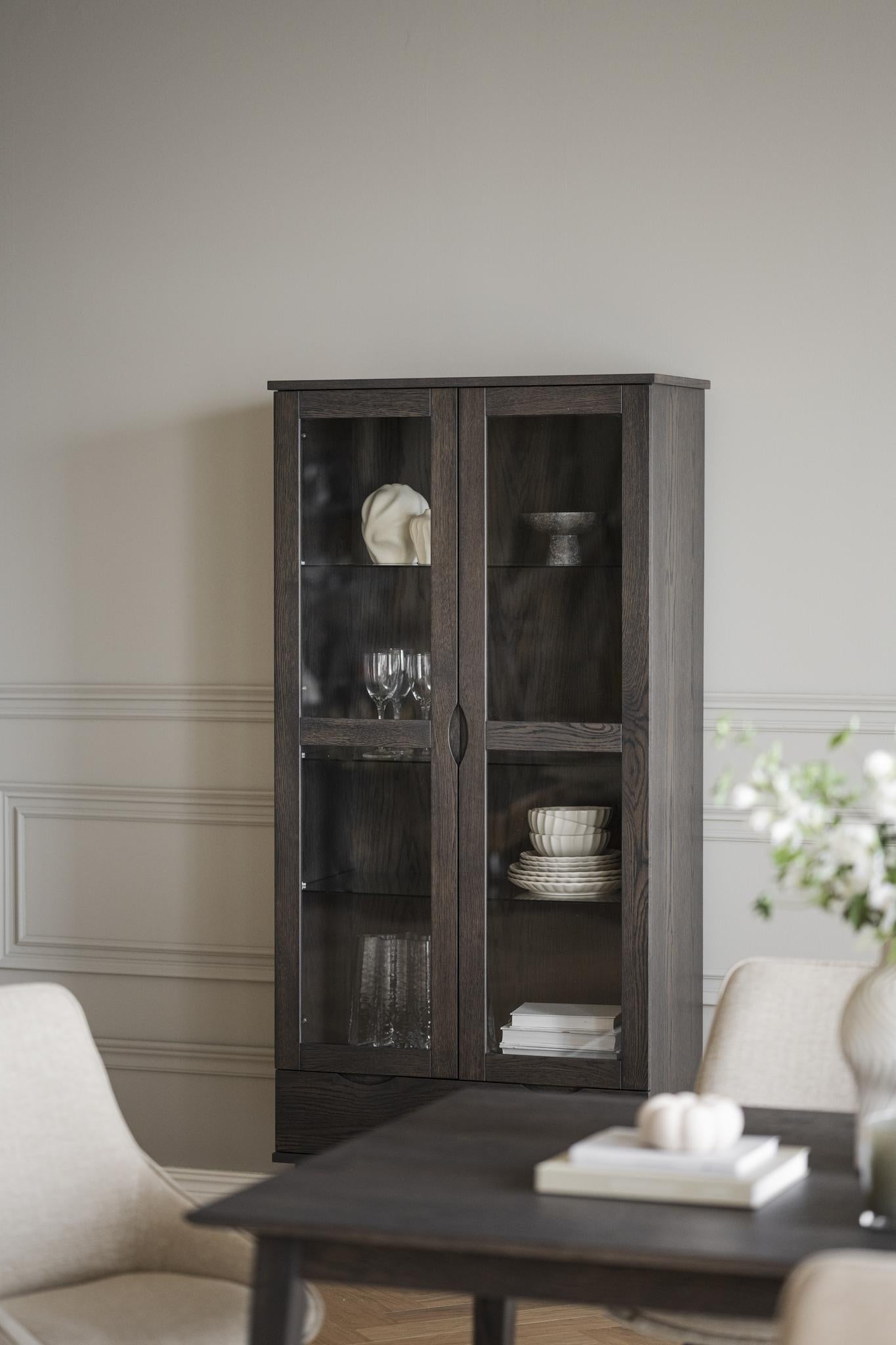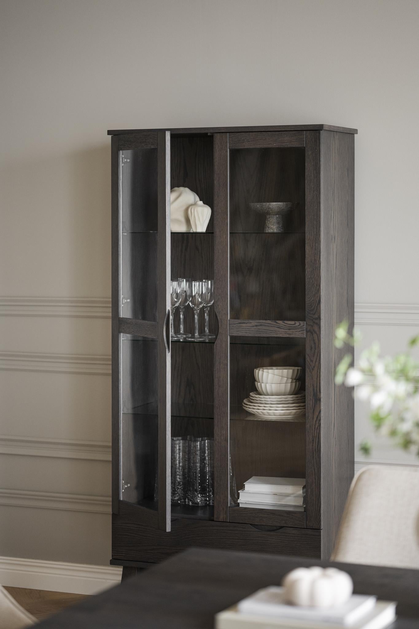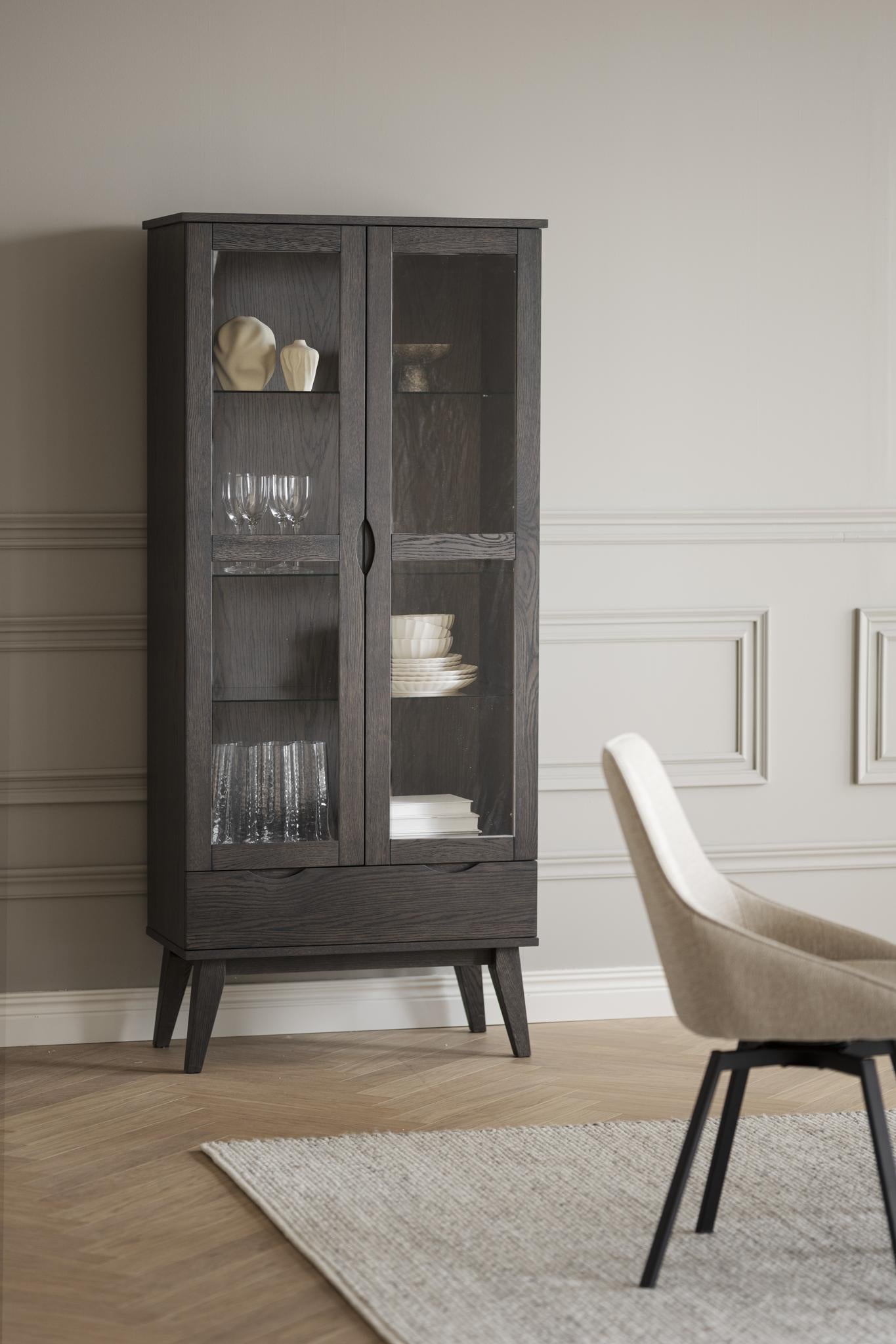 Stilrent och rymligt vitrinskåp i klarlackad ek med glasdörrar samt en låda. Mjukstängande låda och dörrar samt flyttbara hyllplan i härdat glas. Vitrinskåpet ingår i vår breda kollektion Filippa som även har flera matchande matbord och soffbord i olika storlekar.