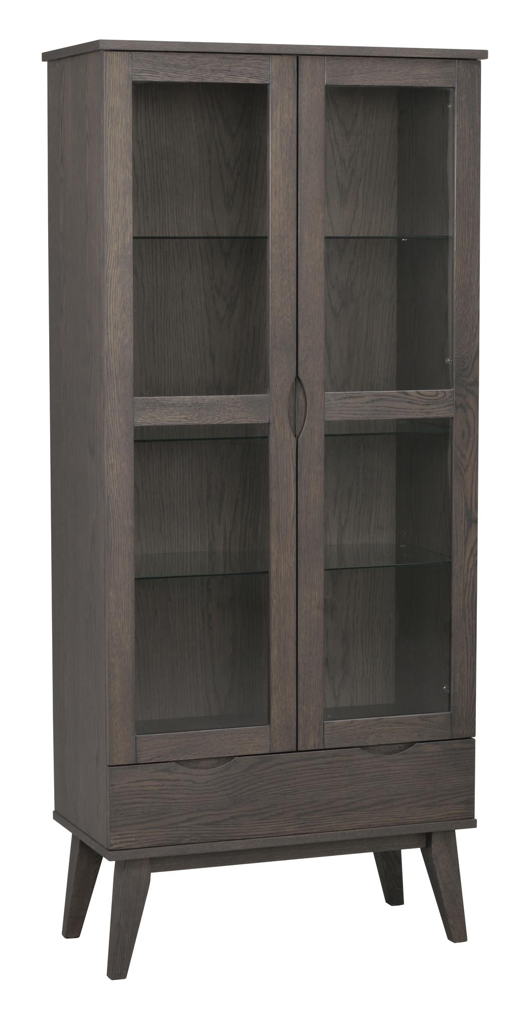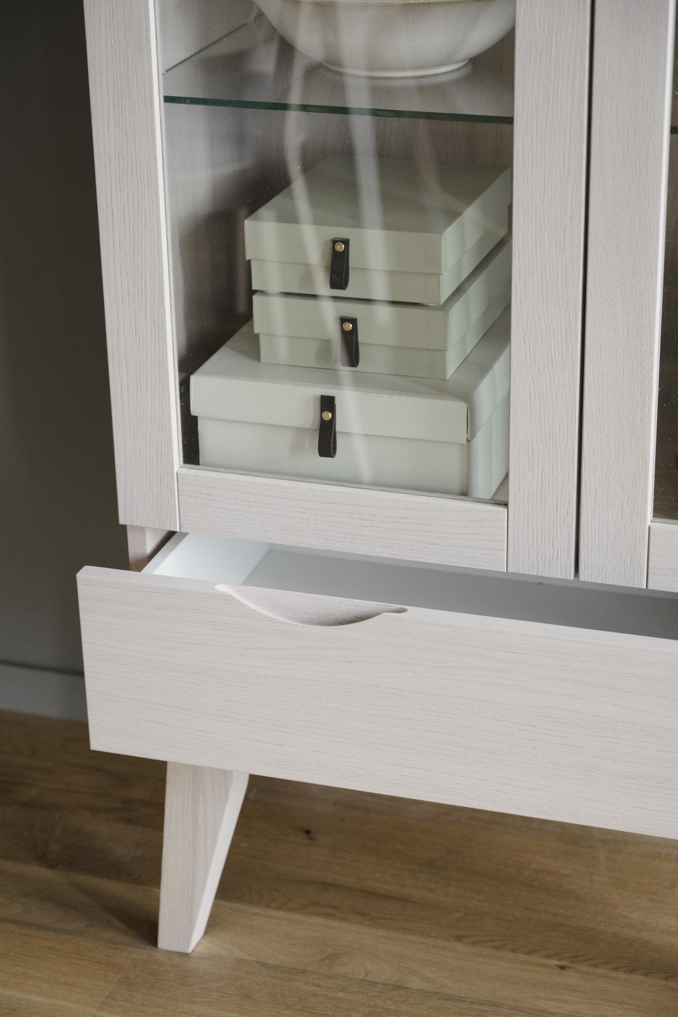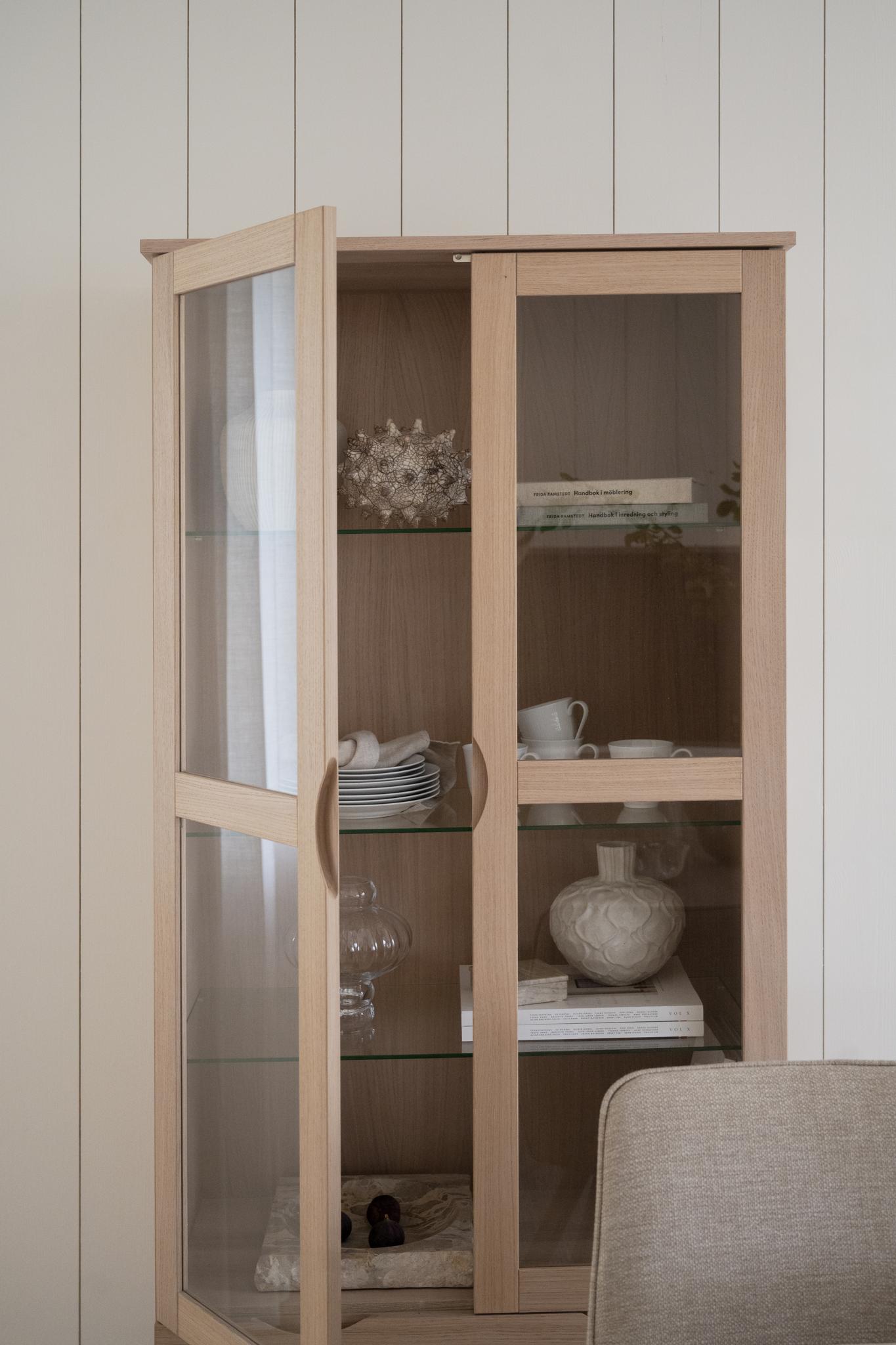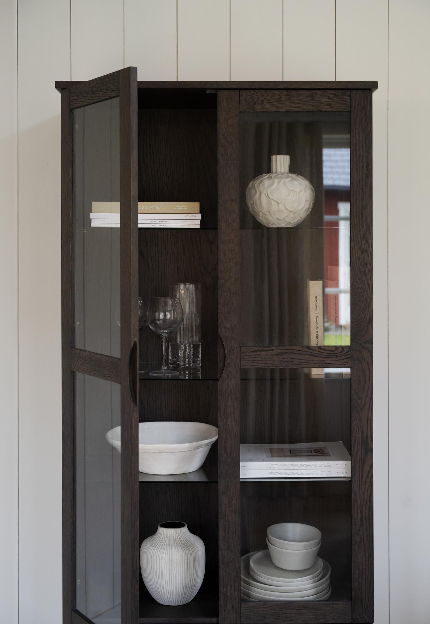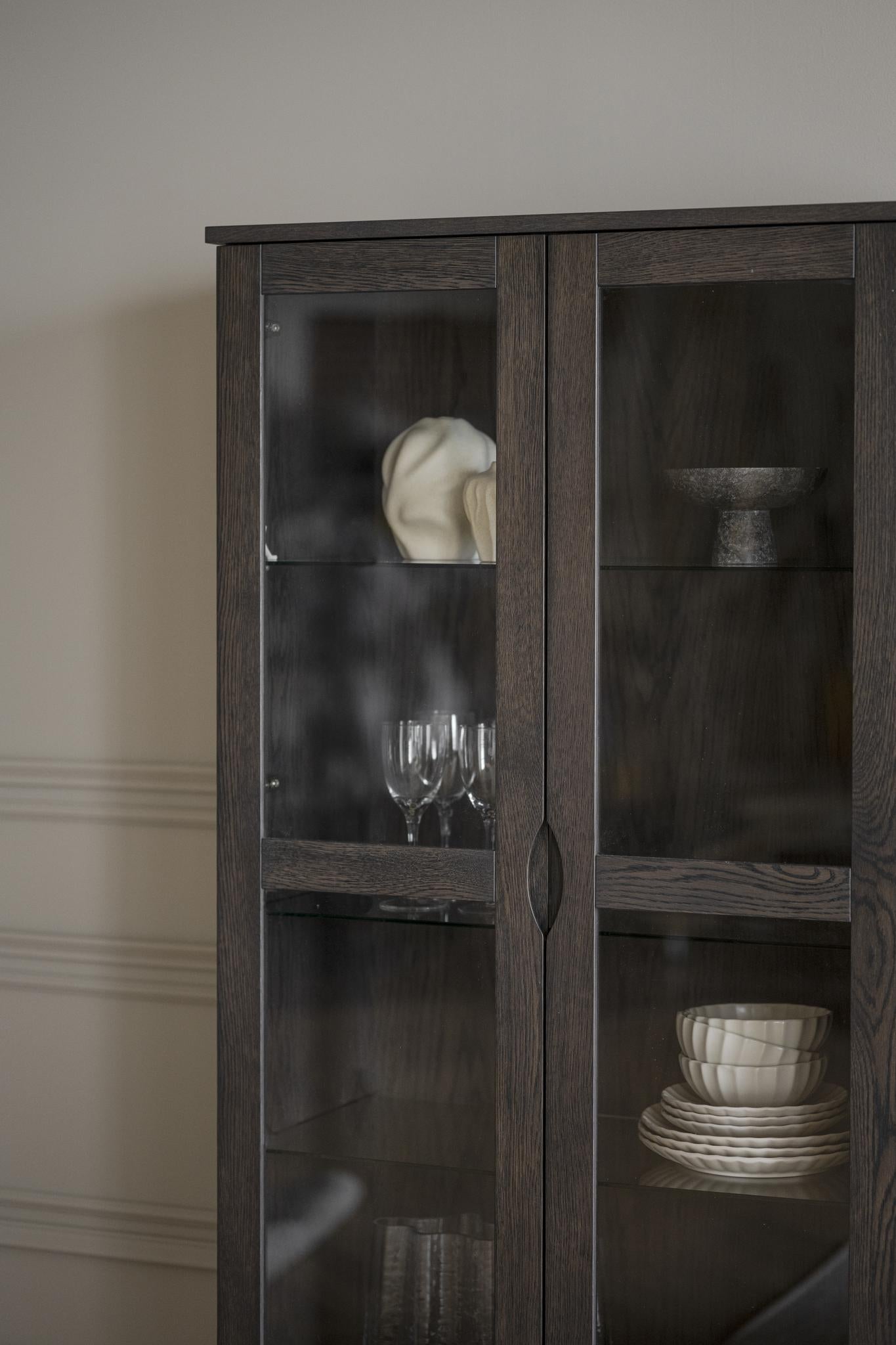 Stilrent och rymligt vitrinskåp i klarlackad ek med glasdörrar samt en låda. Mjukstängande låda och dörrar samt flyttbara hyllplan i härdat glas. Vitrinskåpet ingår i vår breda kollektion Filippa som även har flera matchande matbord och soffbord i olika storlekar.