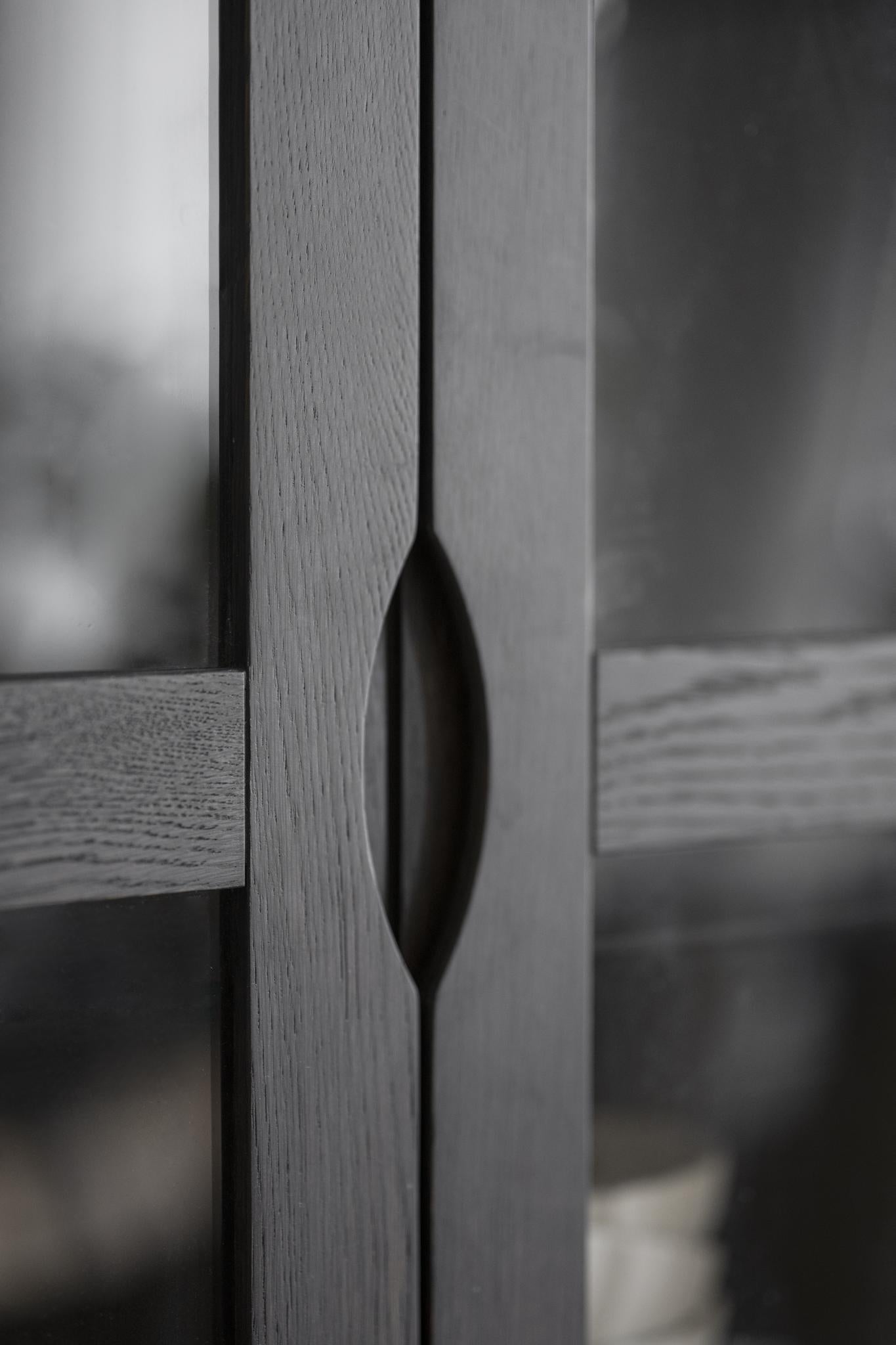 Topp och stomme i lackad ekfaner på spånskiva, ben i massiv lackad ek. Härdat glas i dörrar och hyllplan.