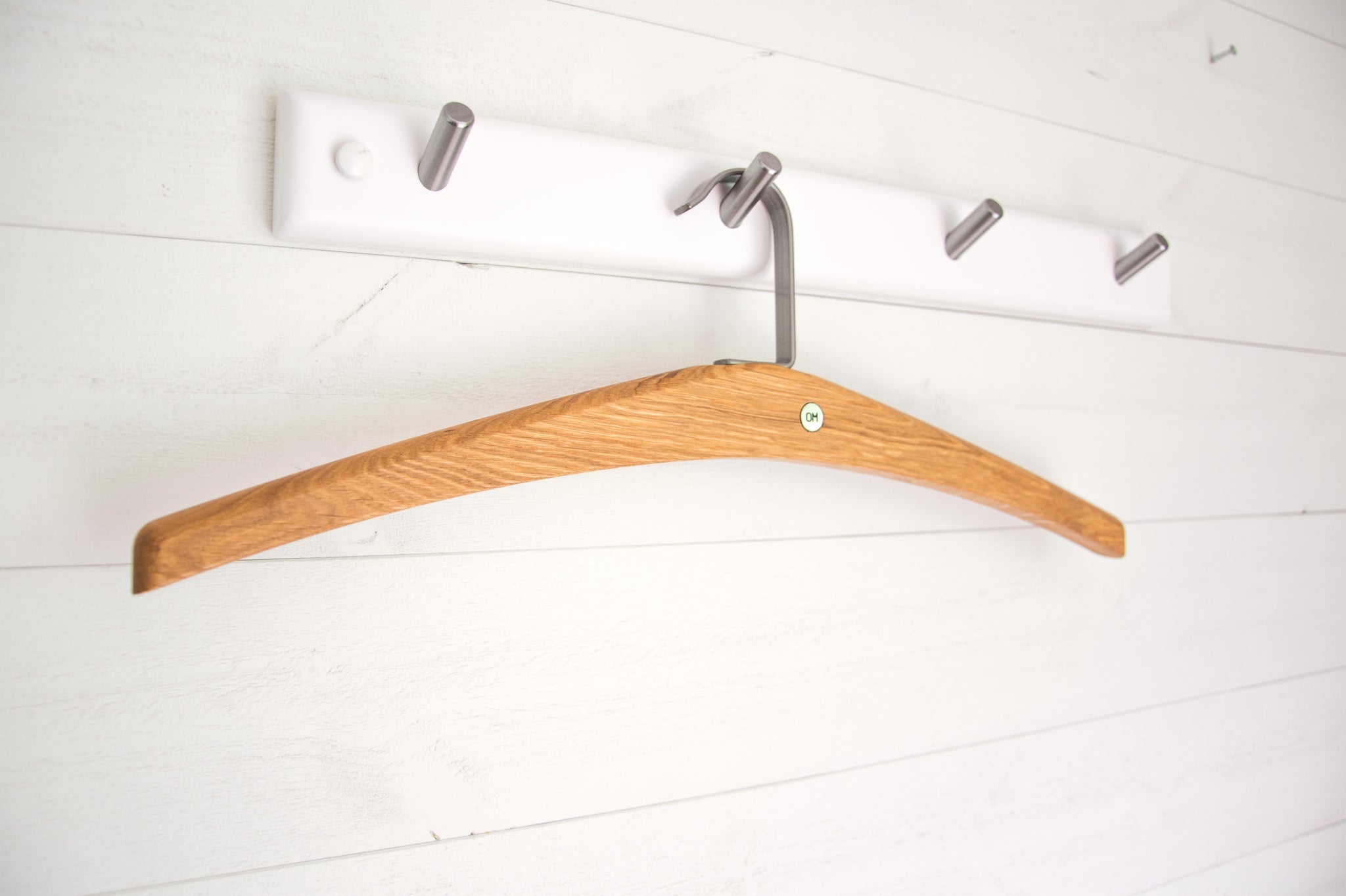 • Träklädhängare i ek hängande på vit krokpanel med metallkrokar