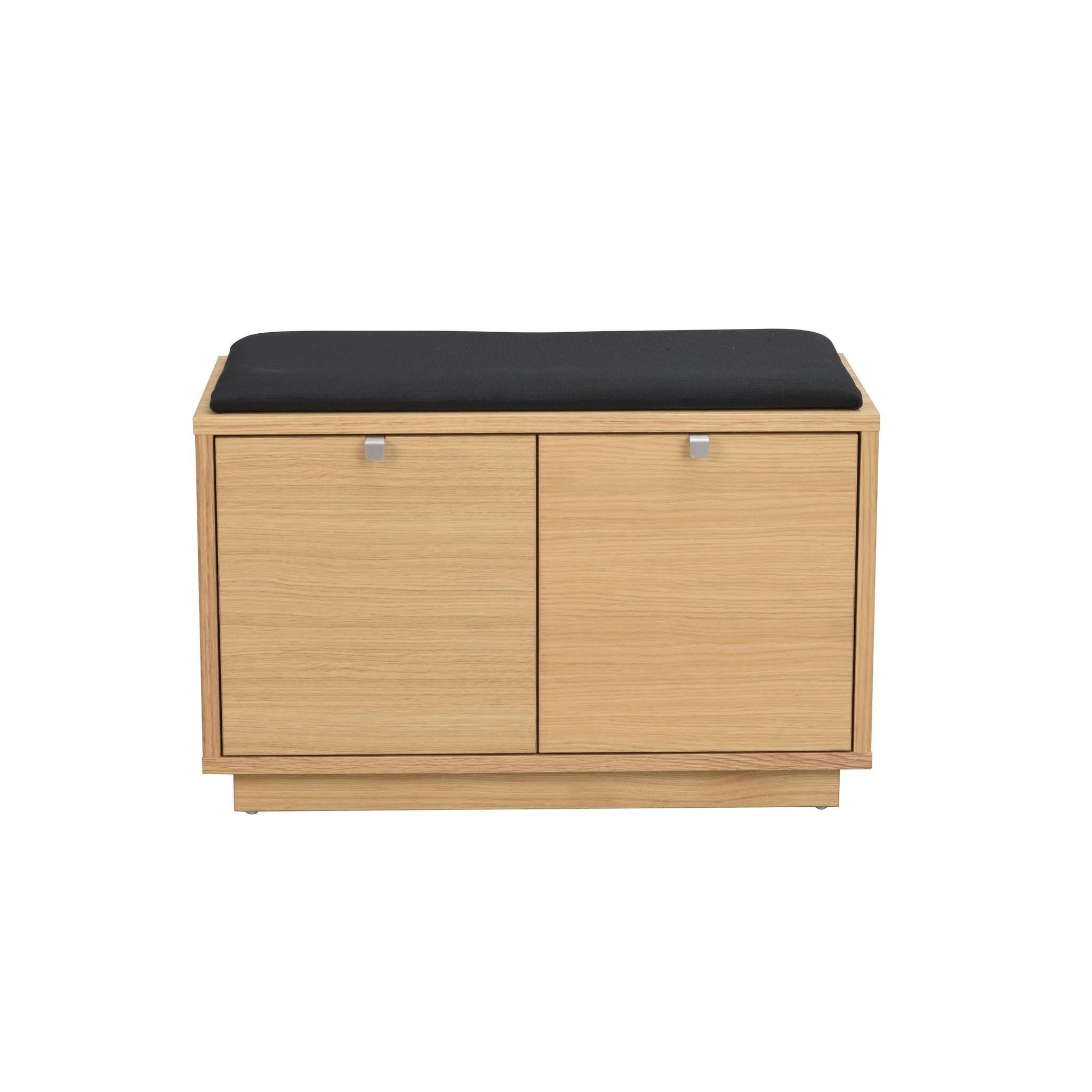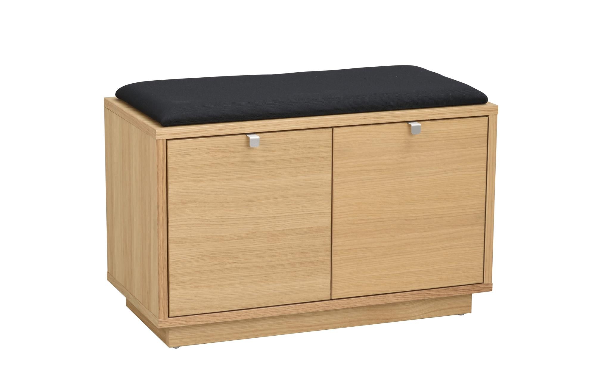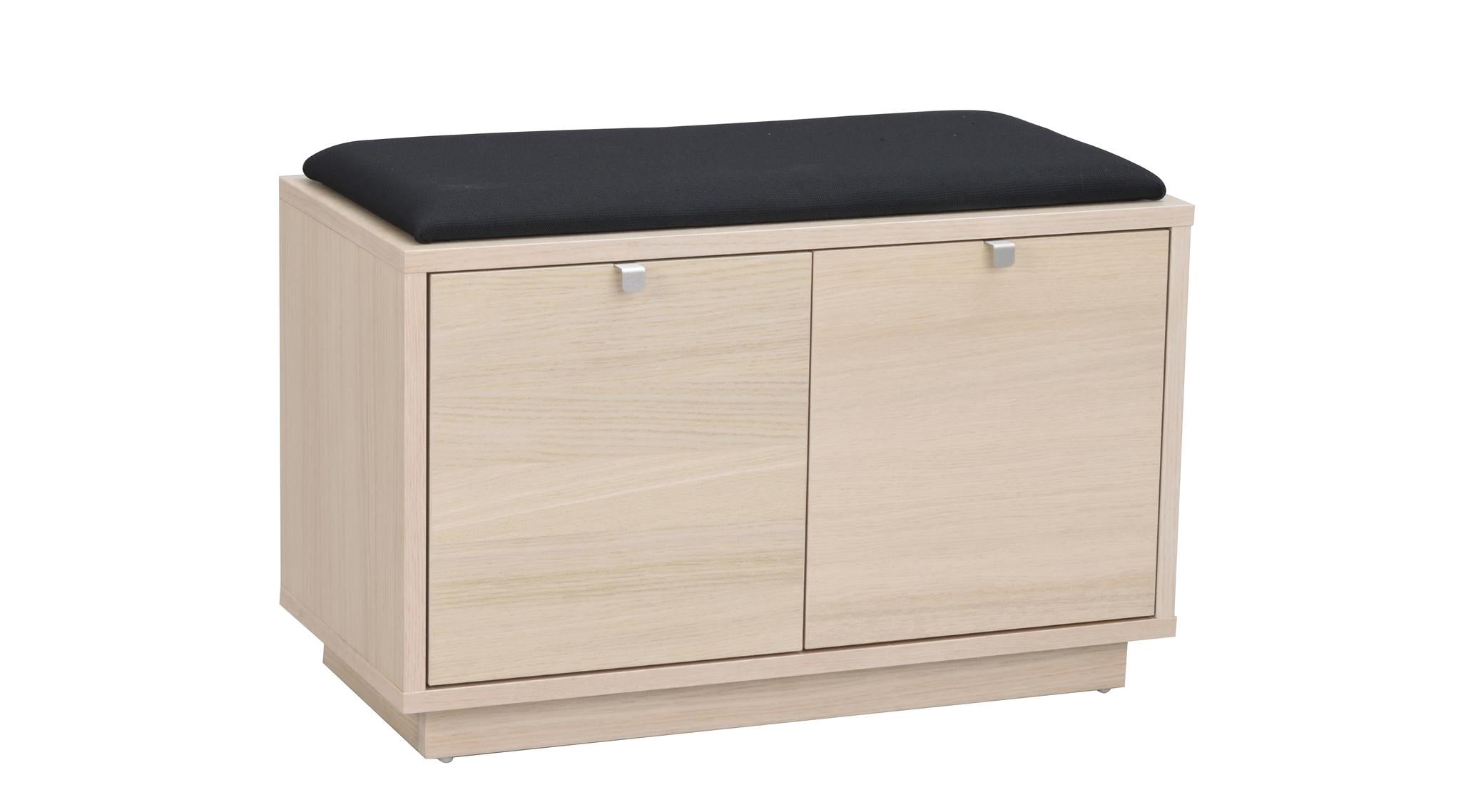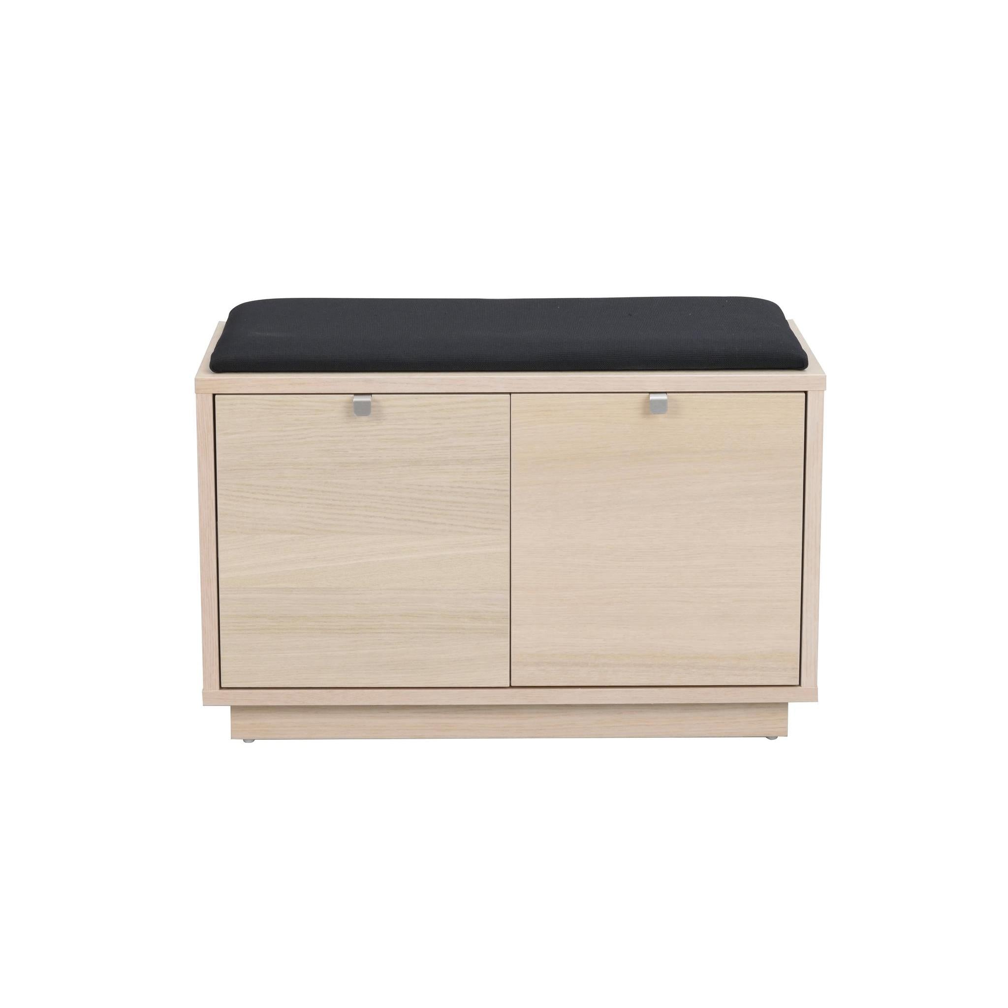 • Hallbänk med skoskåp i ljust trä med svart sittdyna och två dörrar för förvaring