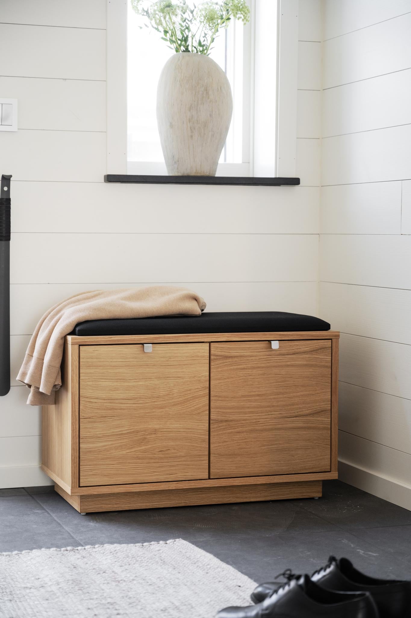 • Hallbänk i ek med svart dyna och förvaringslådor, beige pläd, vit vägg med hylla och vas