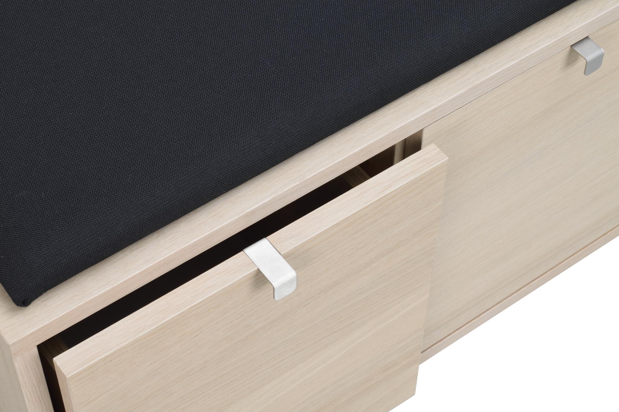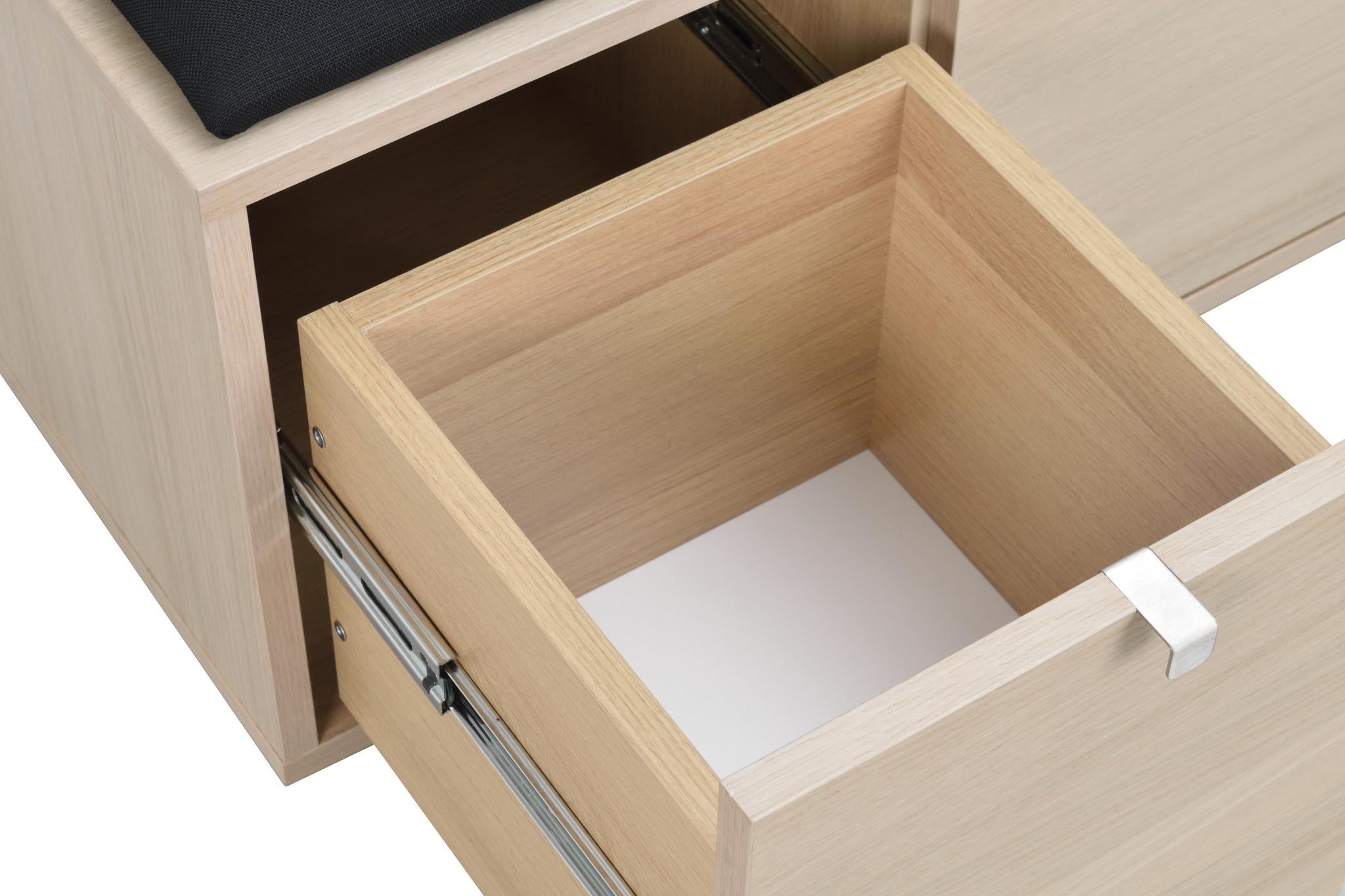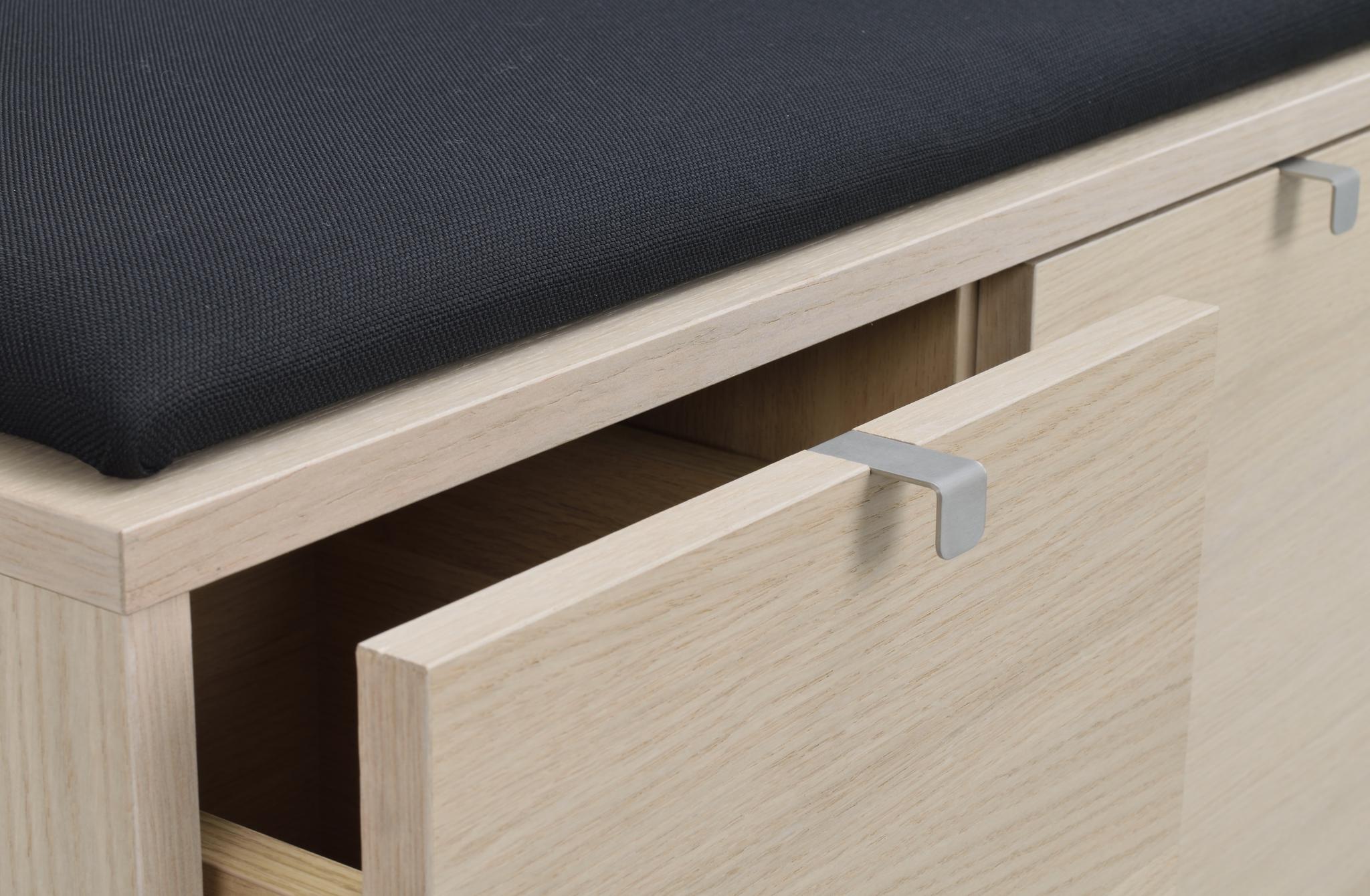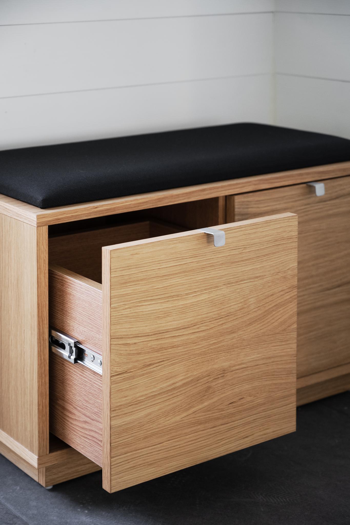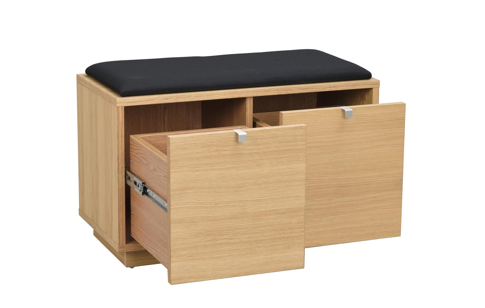 • Hallbänk i ekfanér med svart dyna och två utdragna förvaringslådor med metallskenor