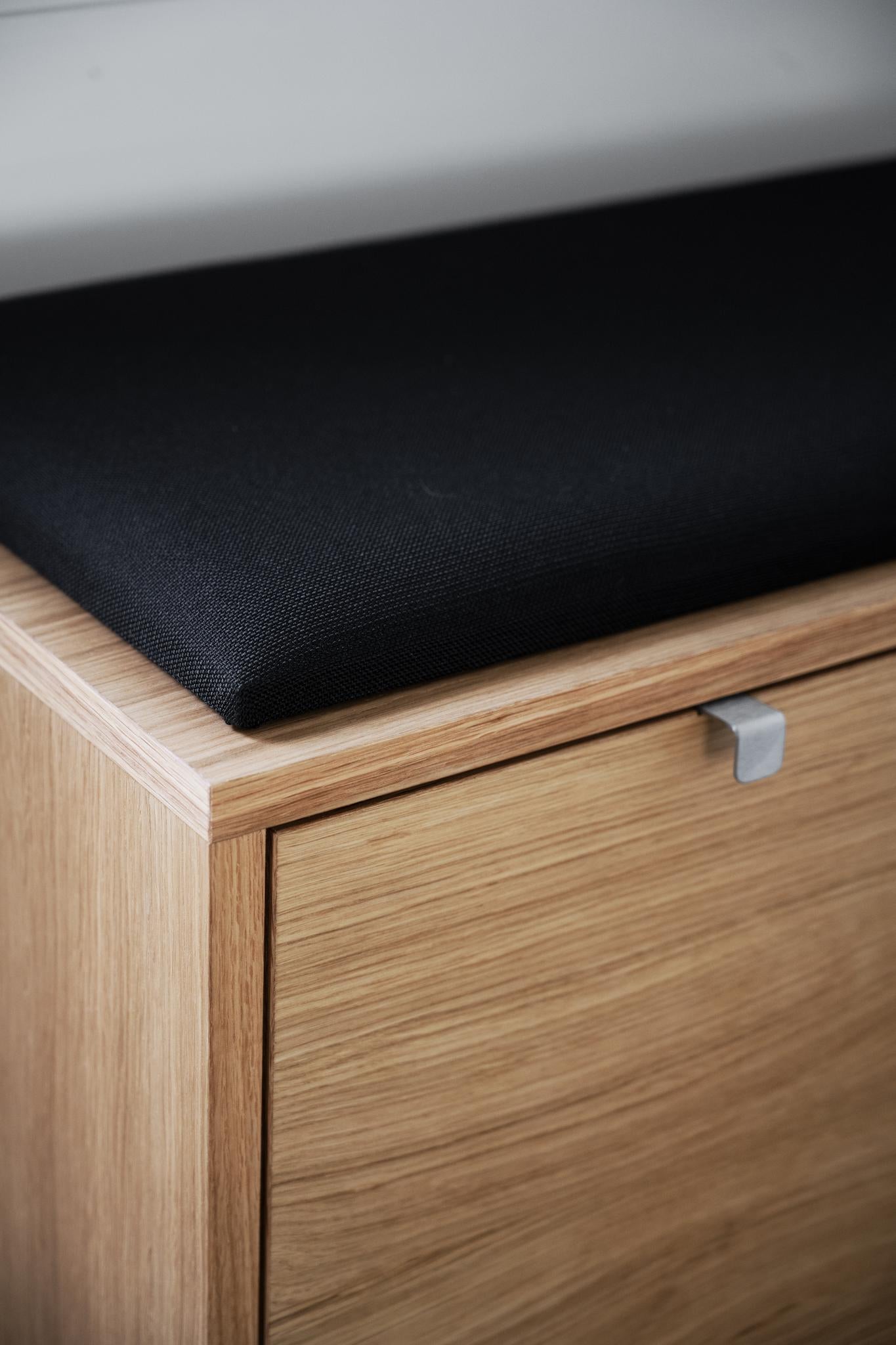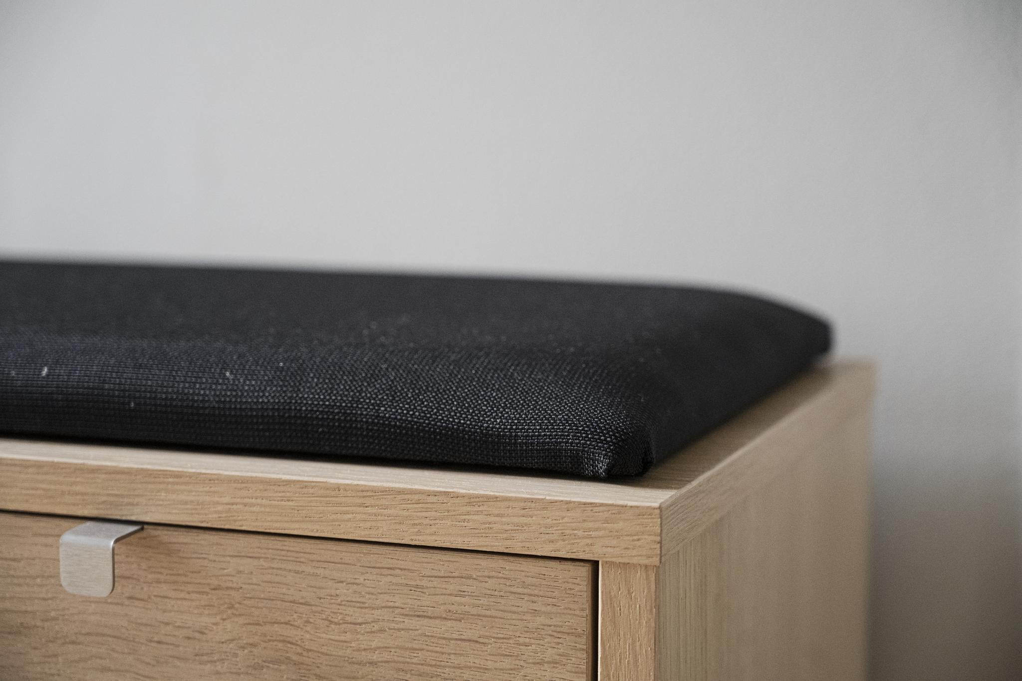 • Sittdyna i svart tyg på träbänk med låda i ljust trä