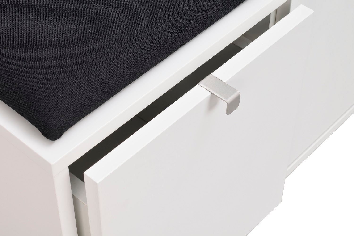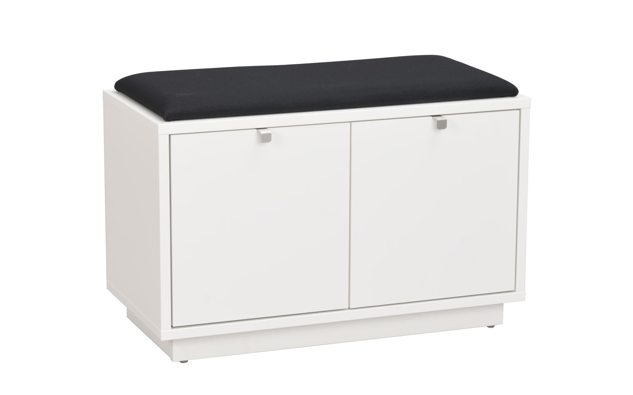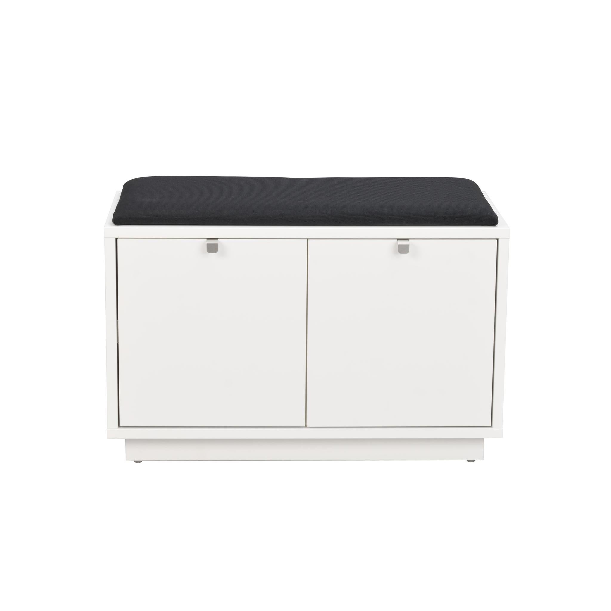• Vit hallbänk med svart dyna och två luckor för skoförvaring