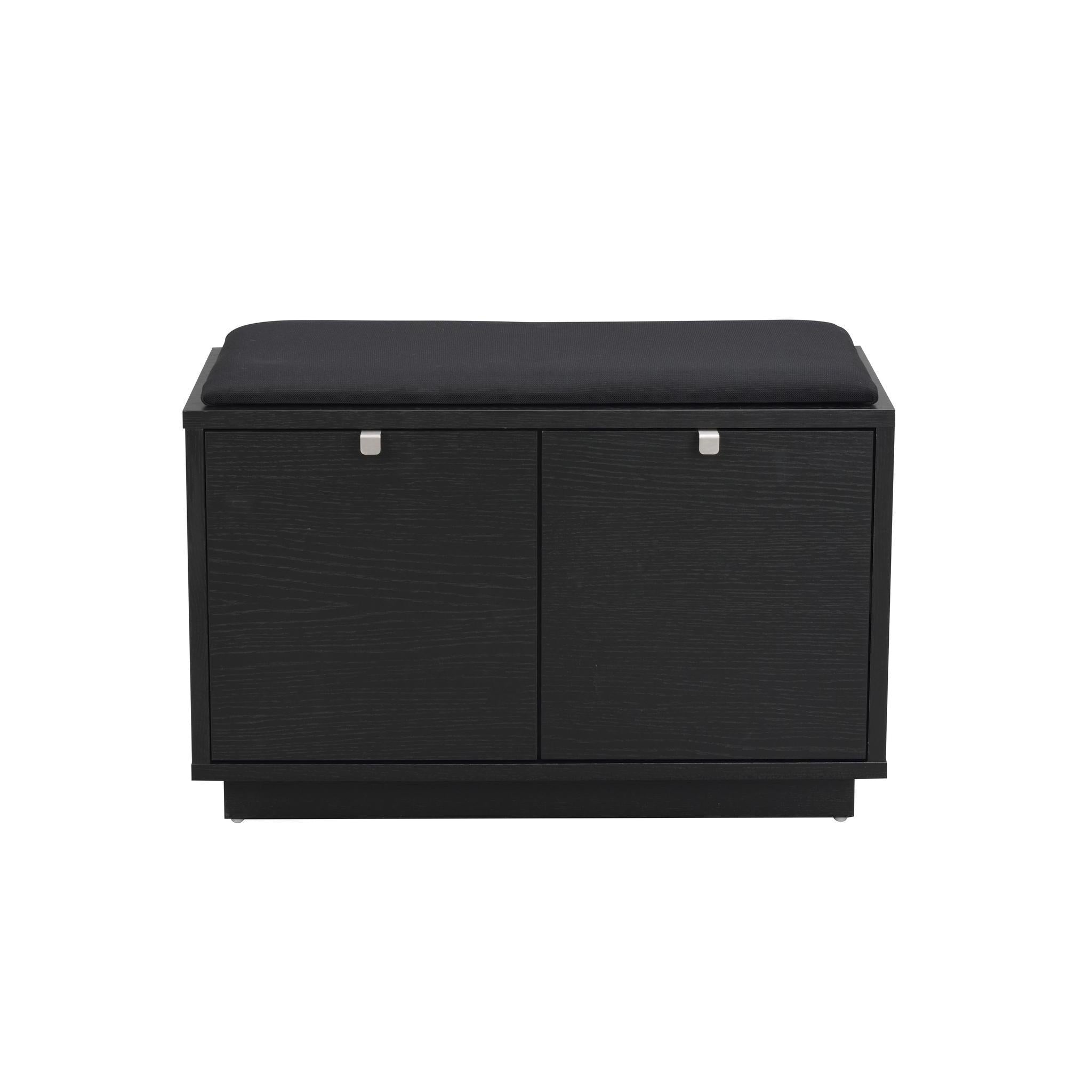 • Svart skobänk med två dörrar och grå sittdyna, modern design i trä