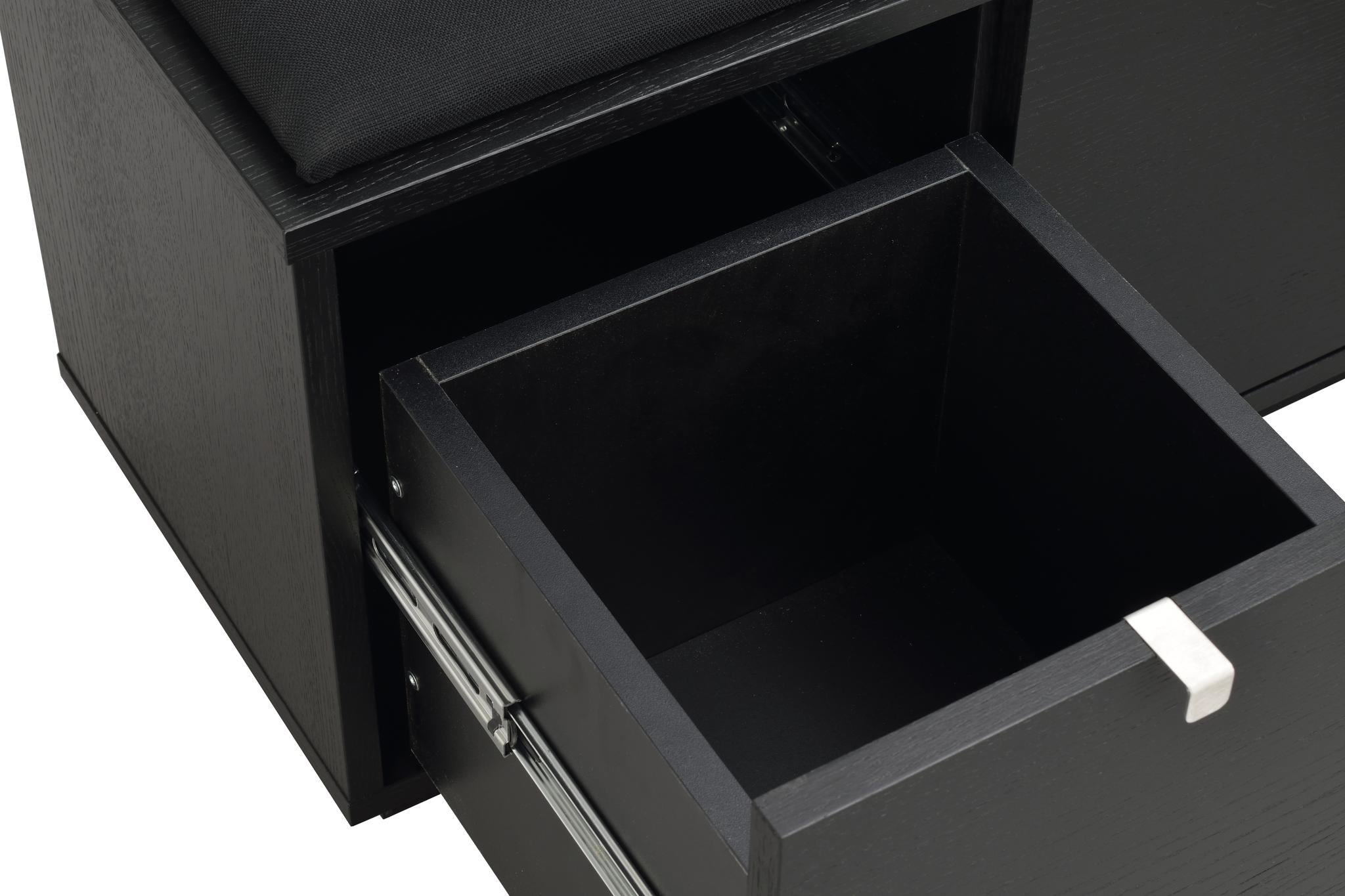 • Svart skobänk med två utdragslådor och stoppad sittdyna, modern förvaring för hallen
