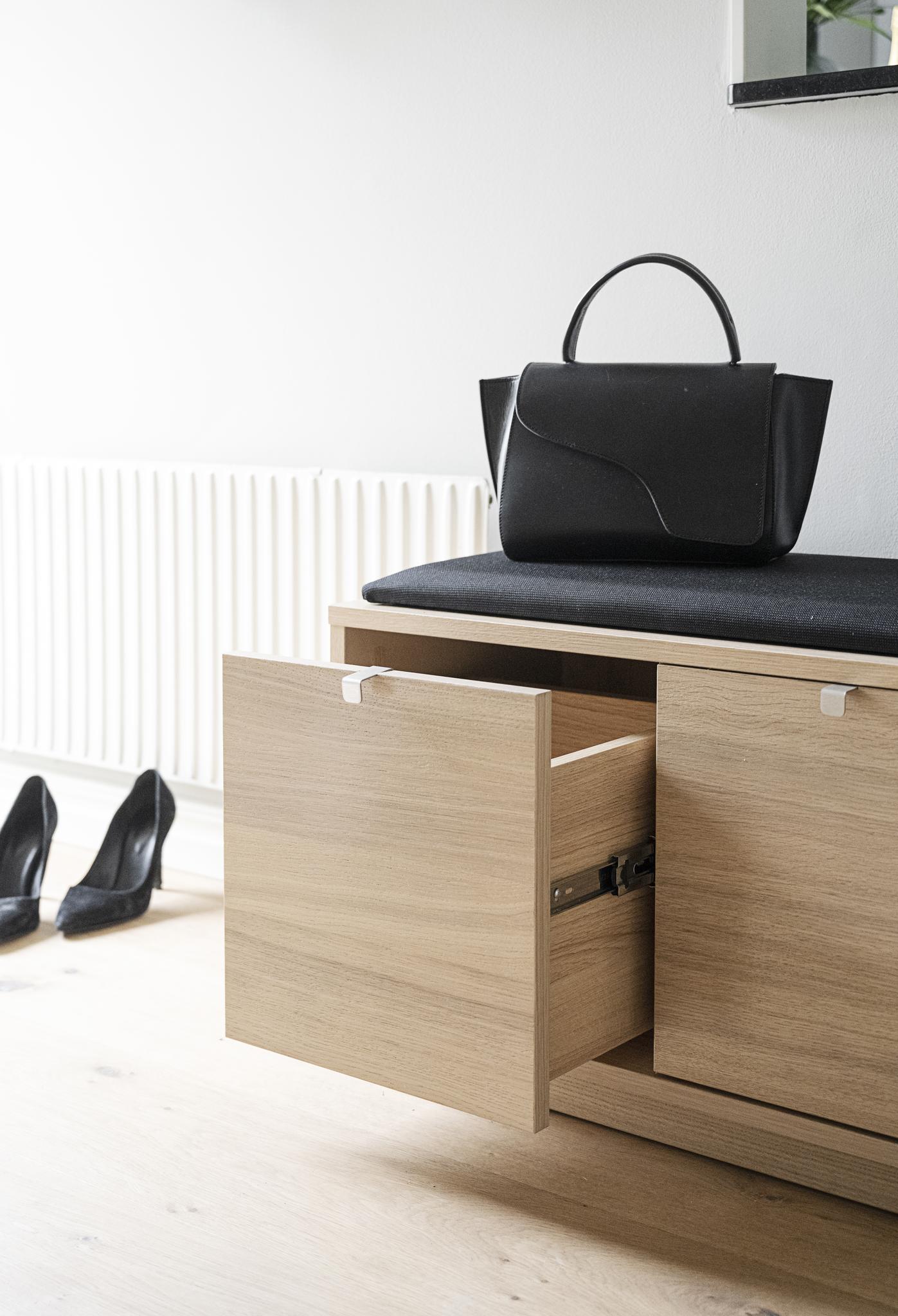 • Hallbänk i ljust trä med svart dyna, öppen låda och svart väska ovanpå