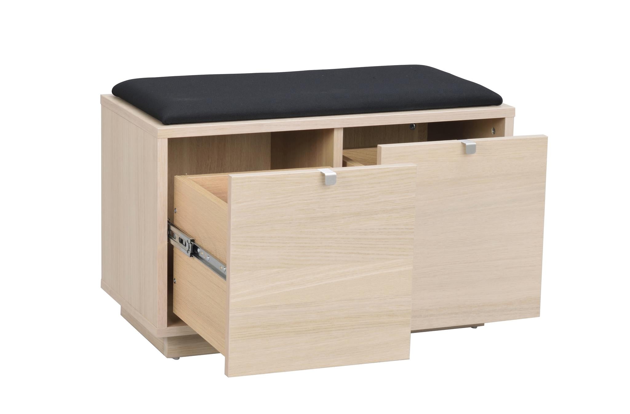 • Hallbänk i ljust trä med svart stoppad sittdyna och två utdragbara lådor med förvaringsutrymme