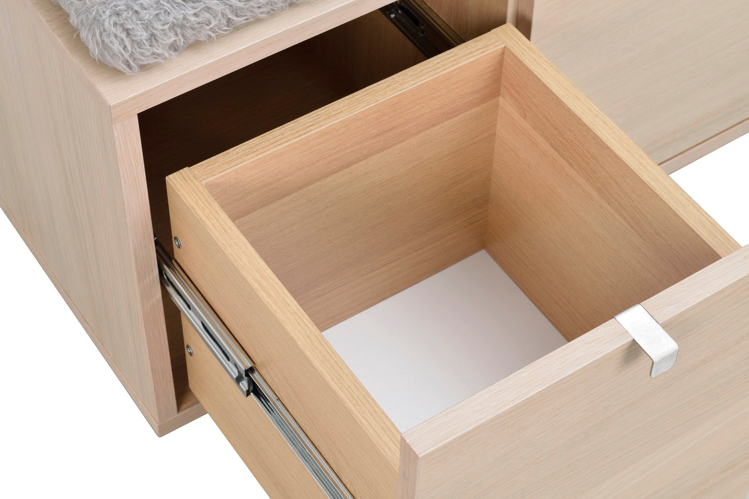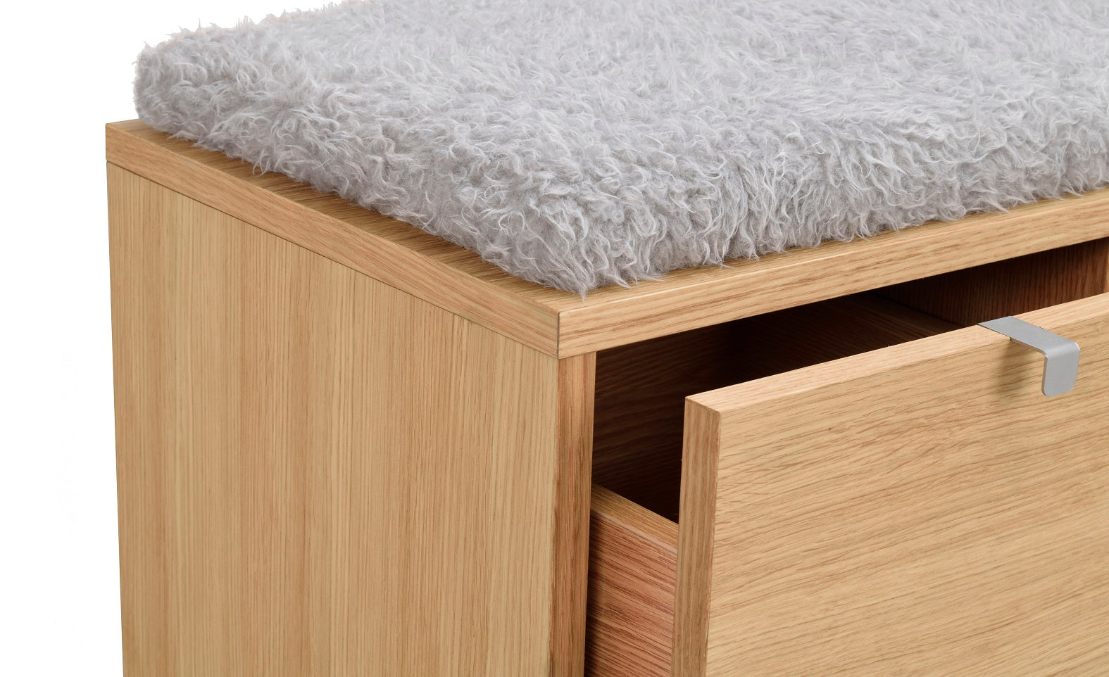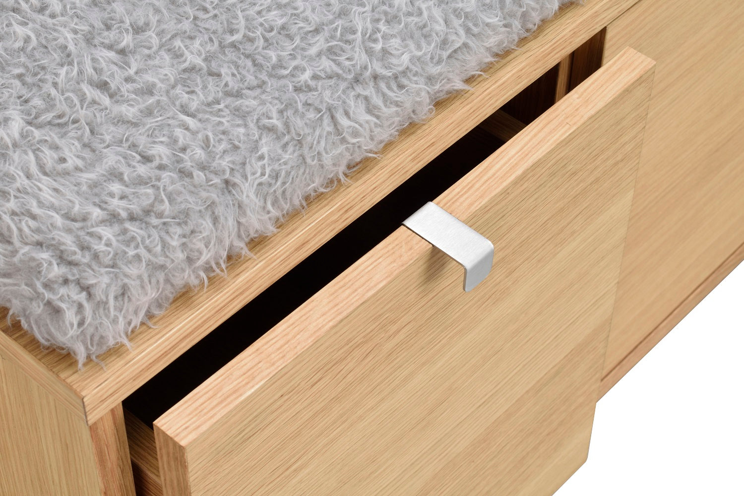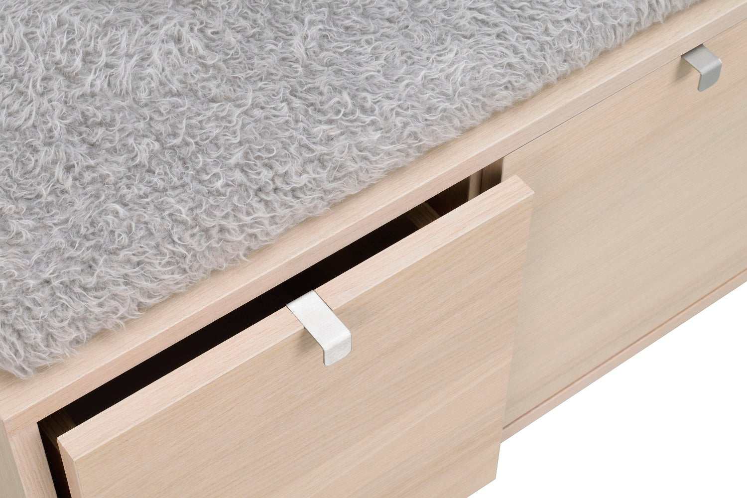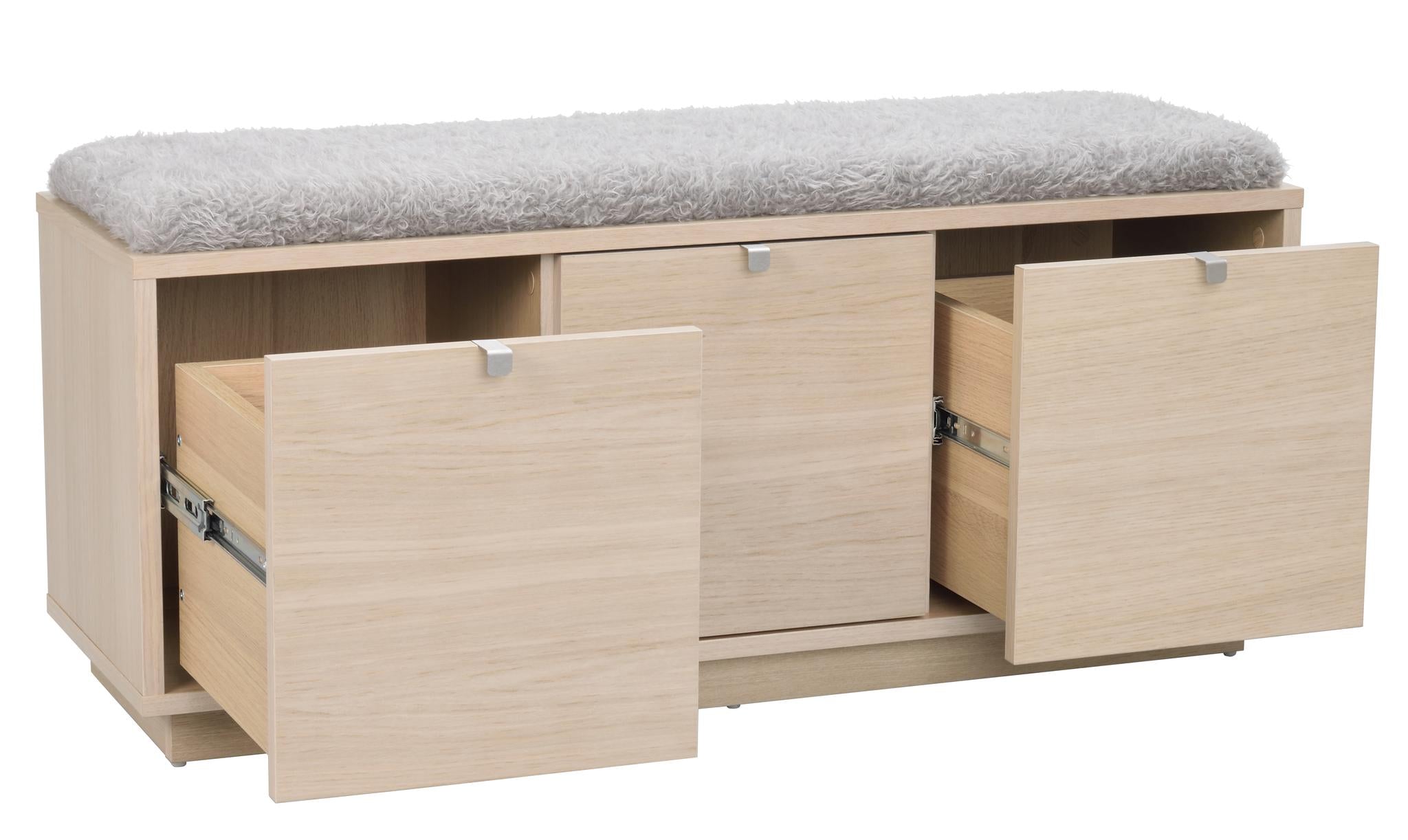 Confetti sittbänk i fanerad oljad ek med dyna i fårskinnsimitation. Praktisk och stilren sittbänk med två rymliga lådor som tar hand om förvaringen. Ingår i hallserien Confetti.