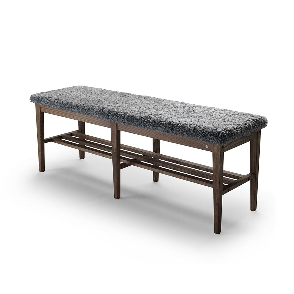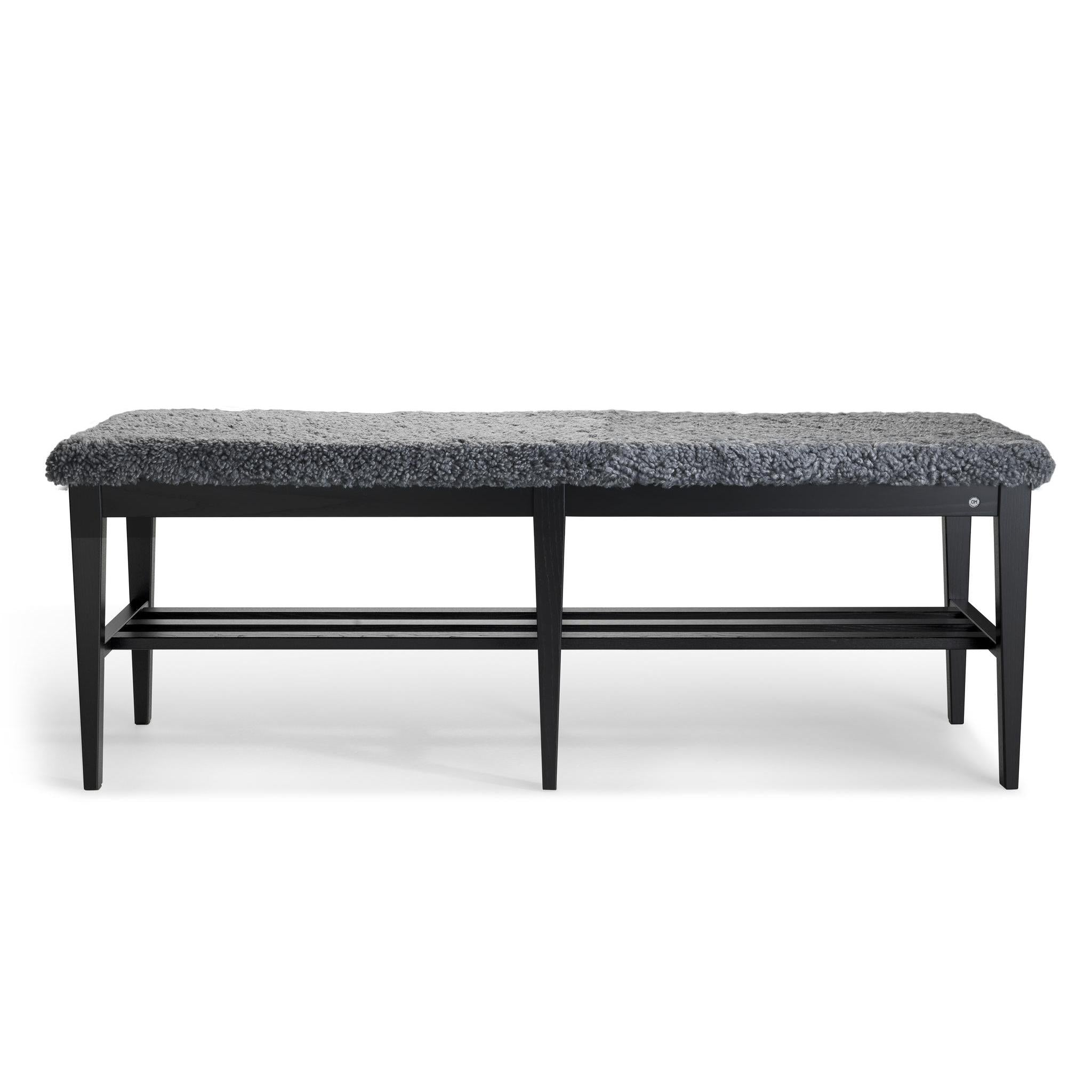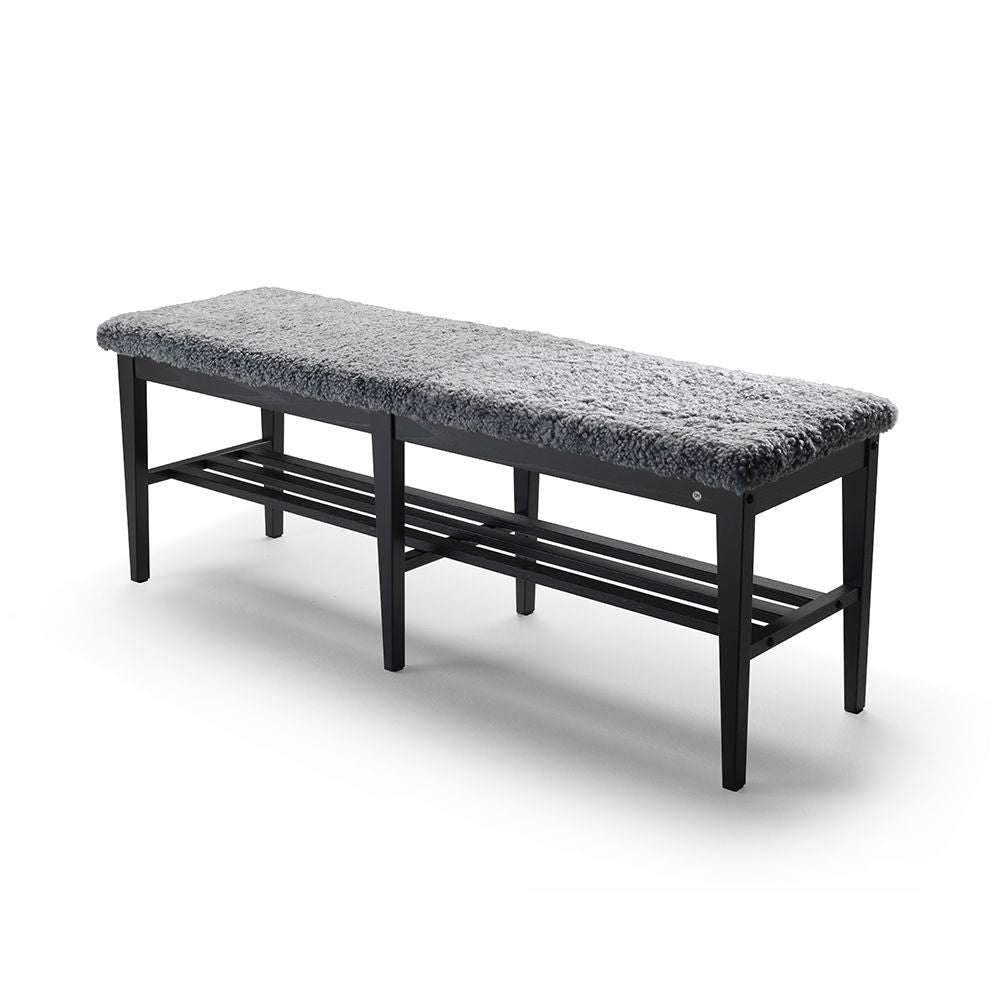 • Bänk med grå fårskinnsdyna och svart träställning med hylla