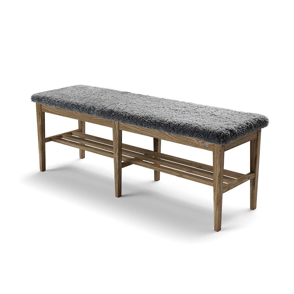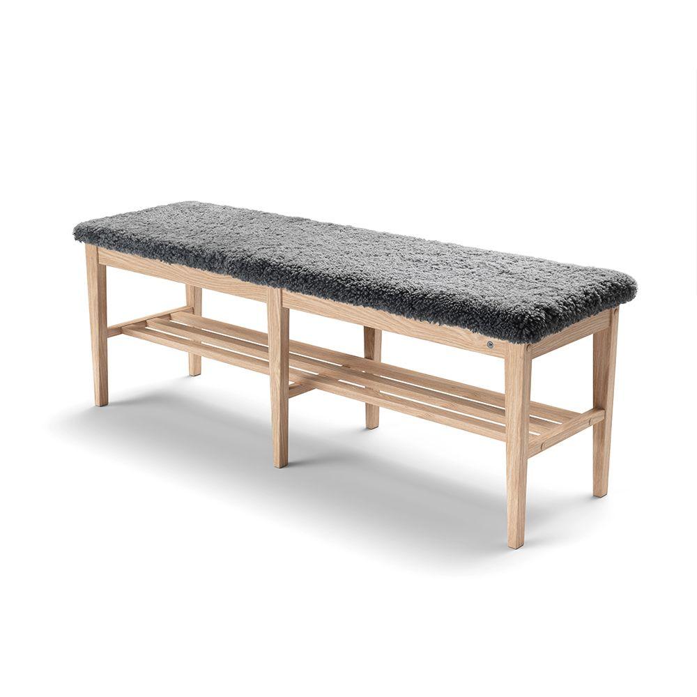 • Hallbänk i ek med grå fårskinnsdyna och skohylla under sittdynan