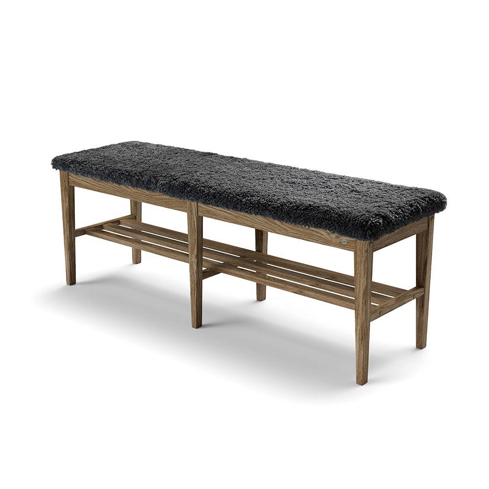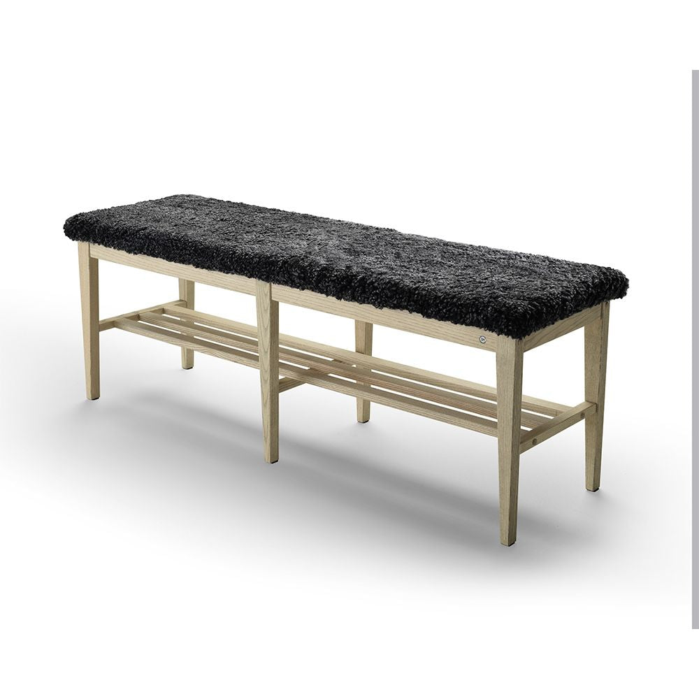• Hallbänk i ek med svart fårskinnsdyna och skoförvaring under sittdynan
