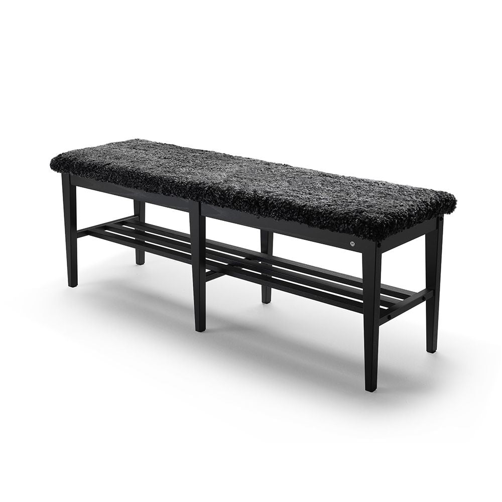 • Bänk med svart fårskinnssits och mörkbrun träram med hylla, frontvy mot vit bakgrund