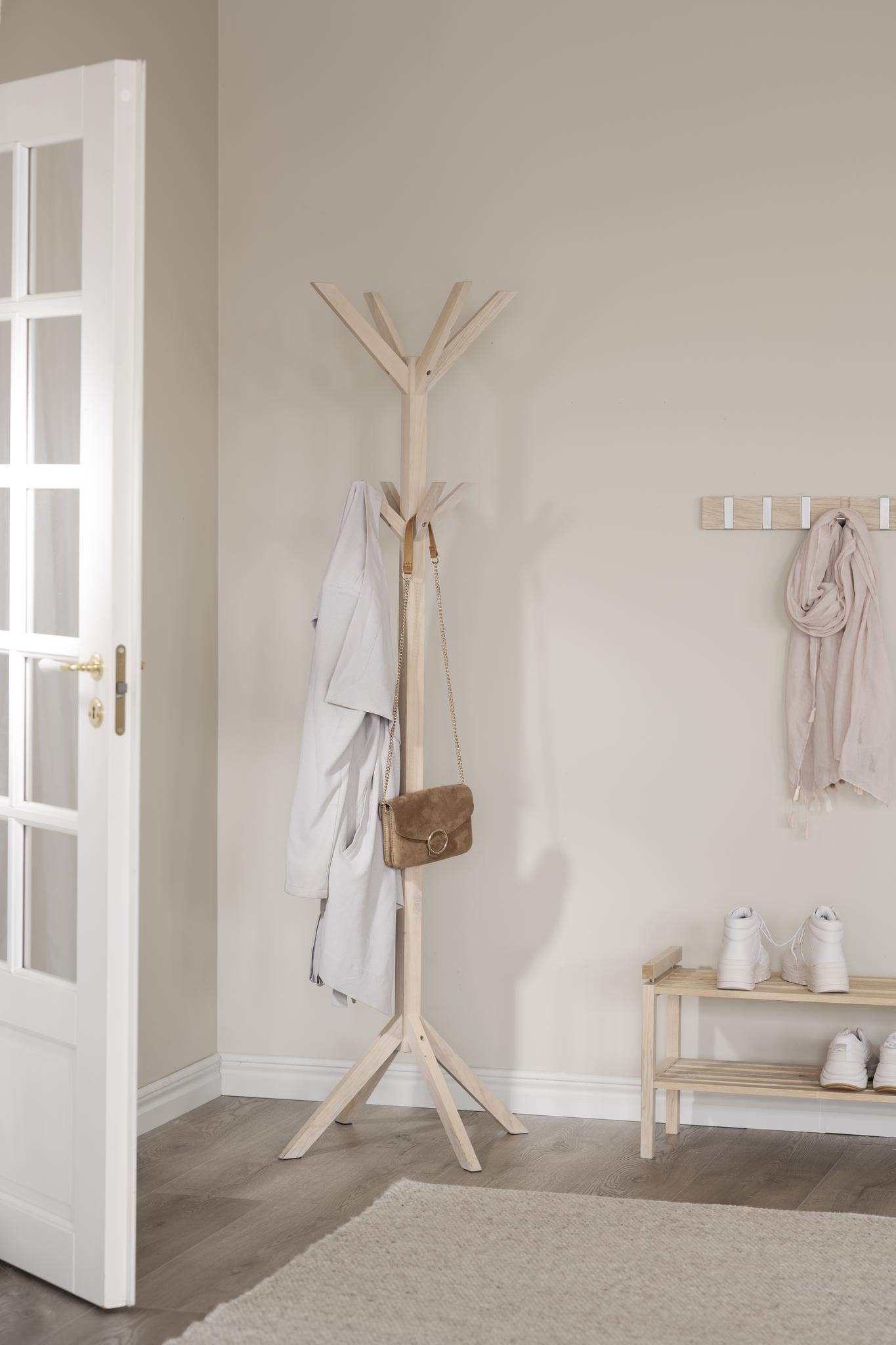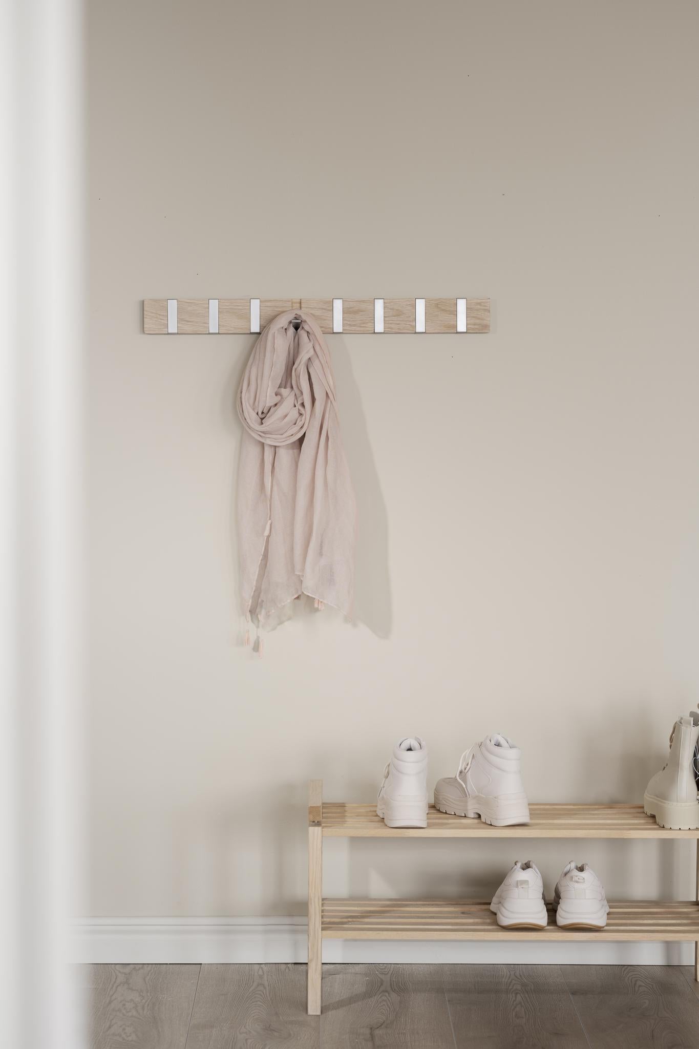 • Ljus träklädhängare i hall med vit dörr, med jacka och väska upphängd, skoställ och väggkrokar vid sidan