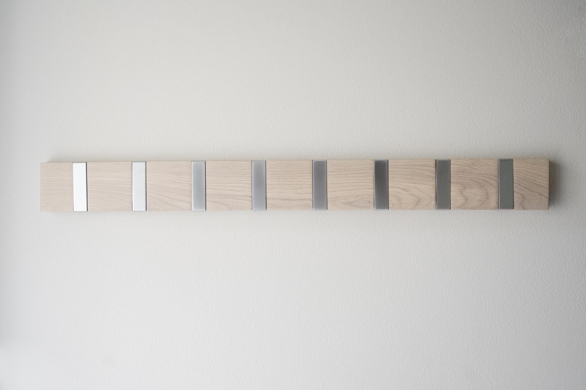 • Krokсписок av ljust trä med sju metallkrokar i gradient från vit till mörkgrå monterad på vit vägg