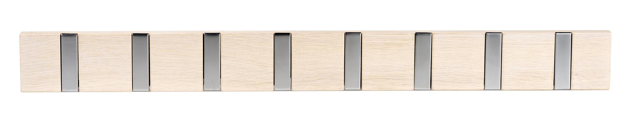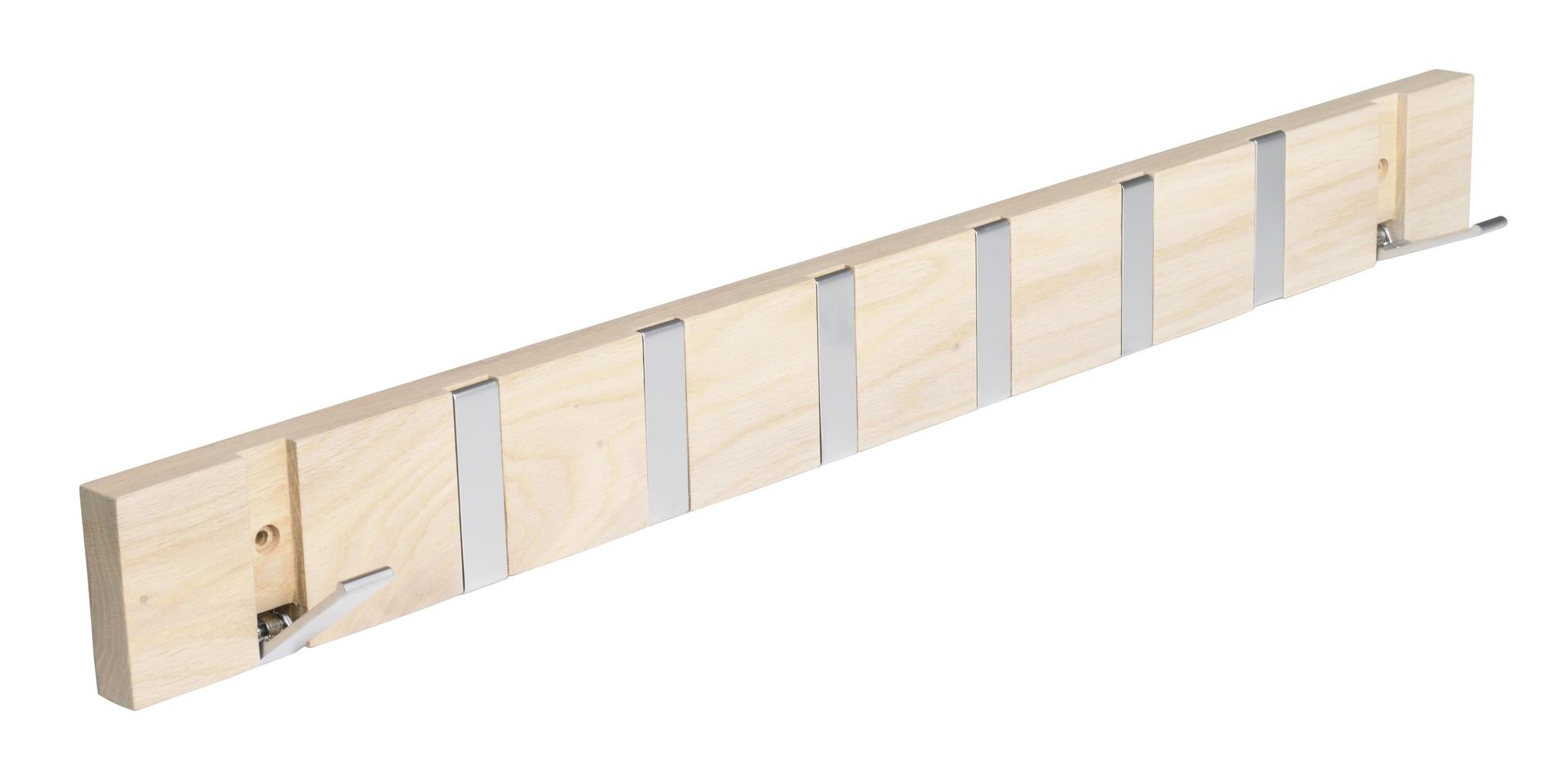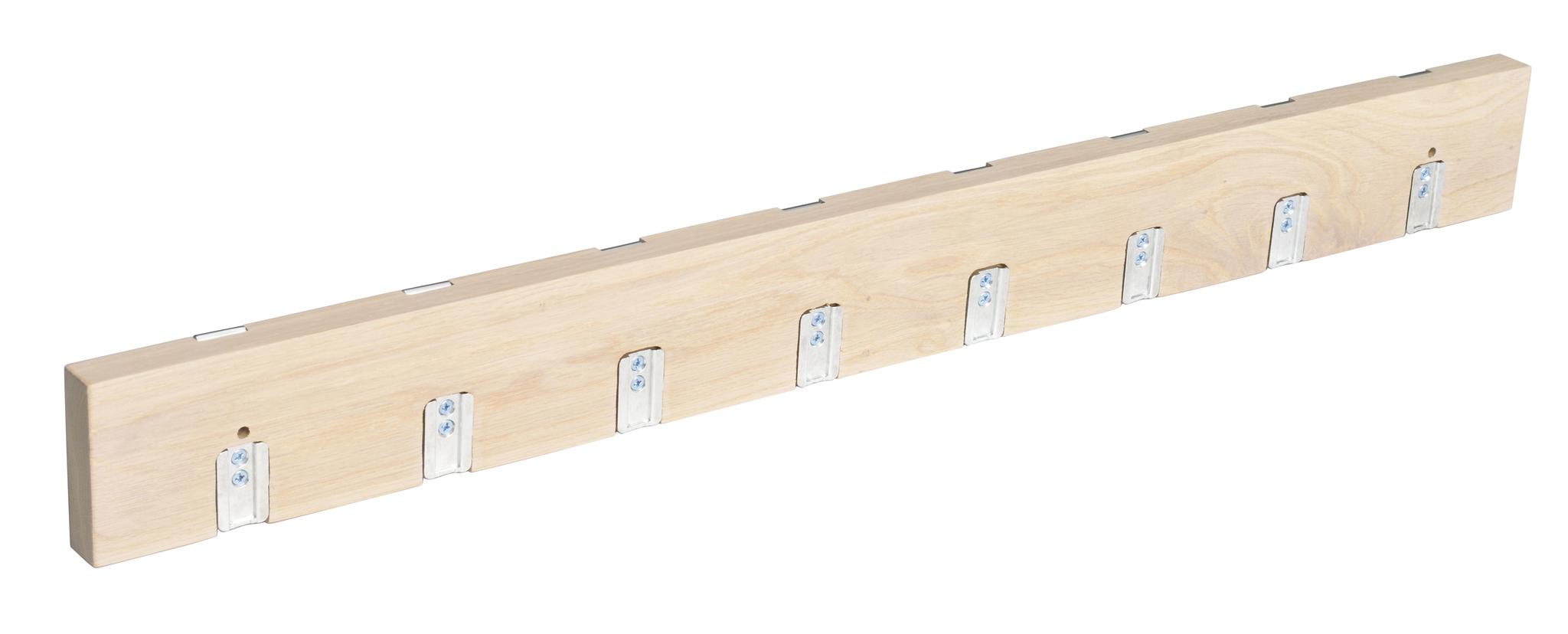 • Krokbräda i ljust trä med 8 vita metallkrokar monterade på rad