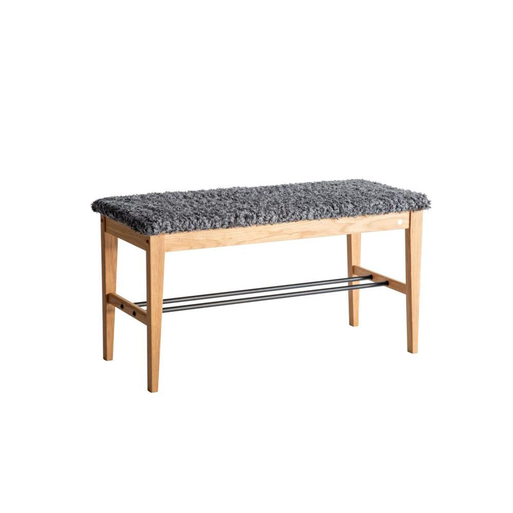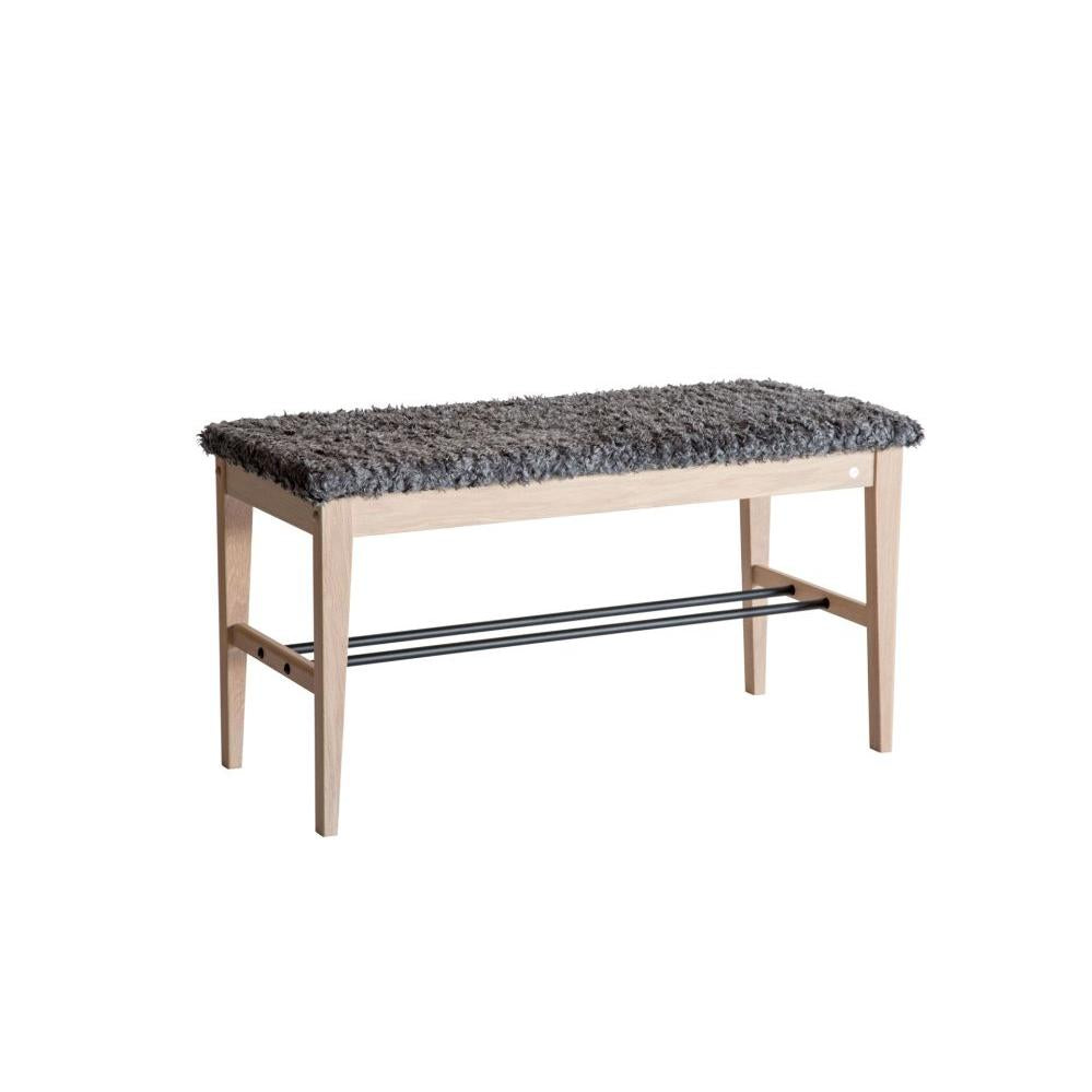 • Hallbänk med grå fluffig sits och träben i mörkbrun ek med metallhylla för skoförvaring