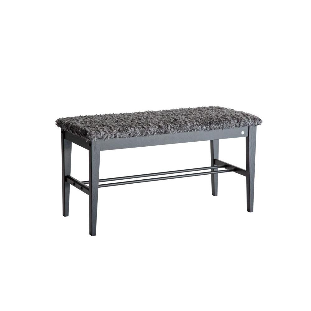 • Hallbänk i ljust trä med grå mockaimitation och svart fotplatta för skoförvaring