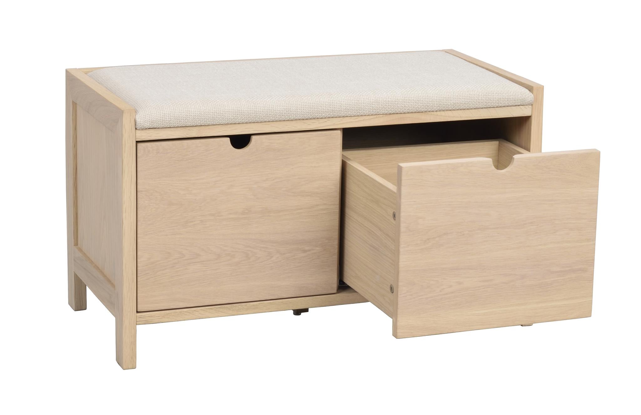 • Hallbänk i ek med stoppad sits och två förvaringslådor, naturligt trä med beige klädsel
