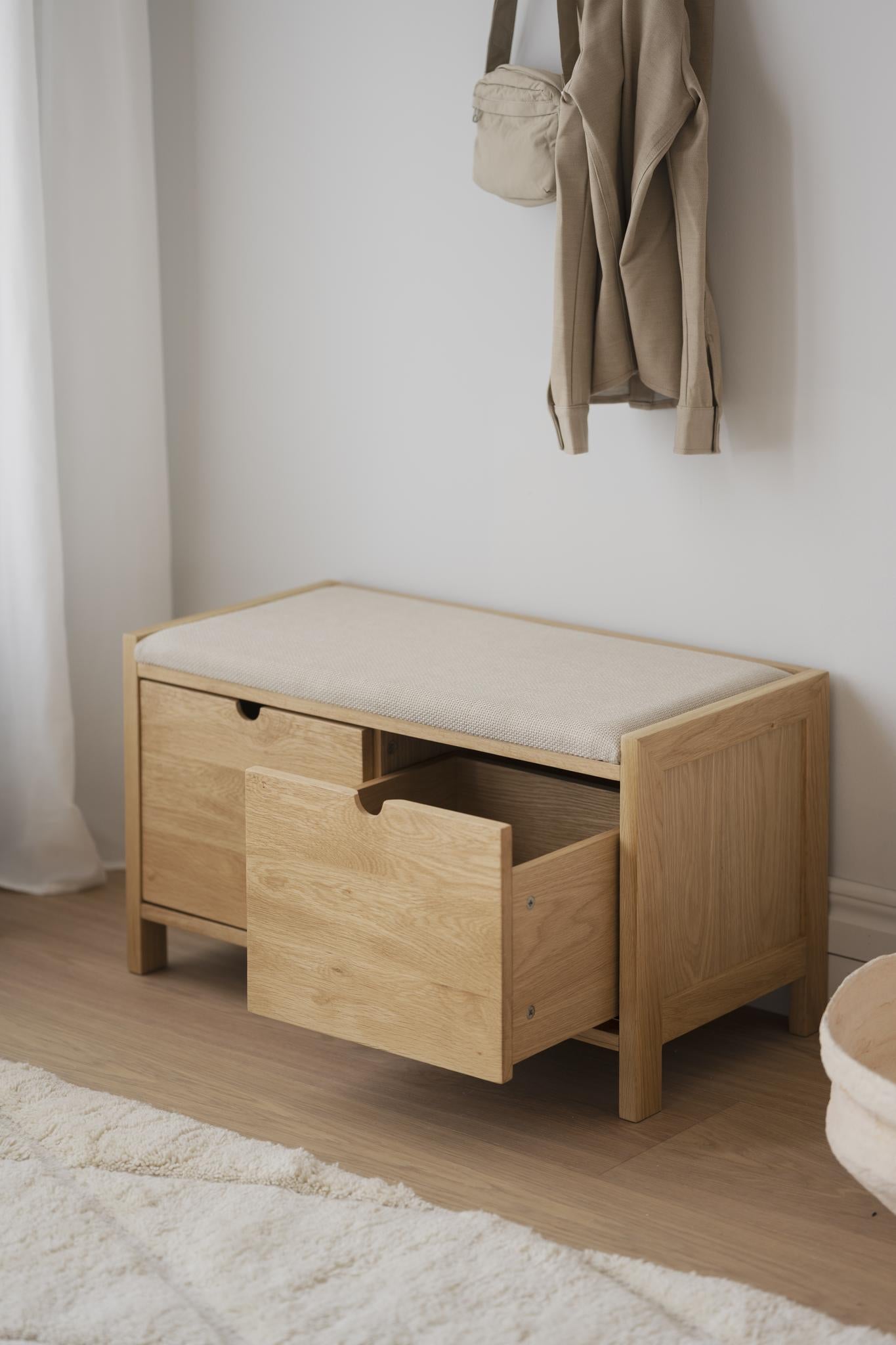 • Hallbänk i ek med stoppad sits och två utdragbara lådor för förvaring