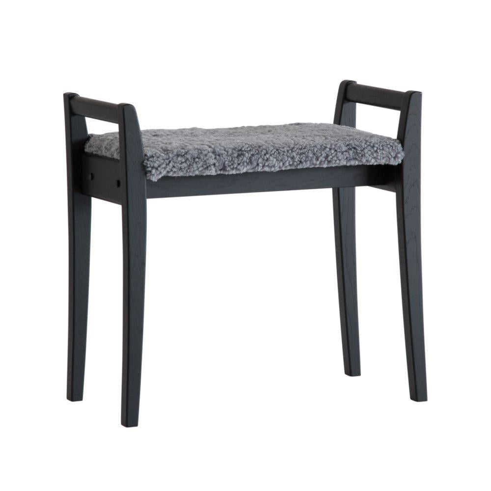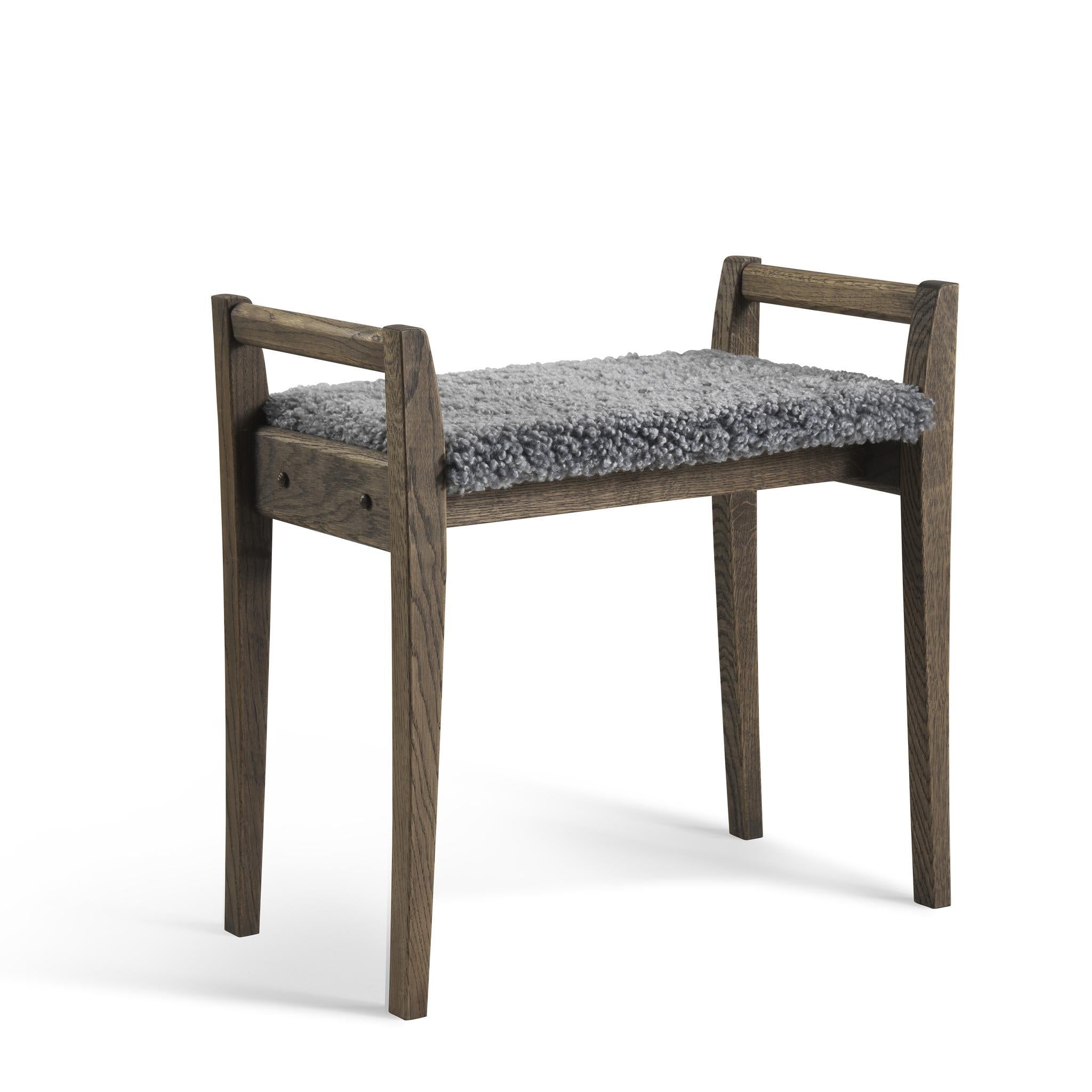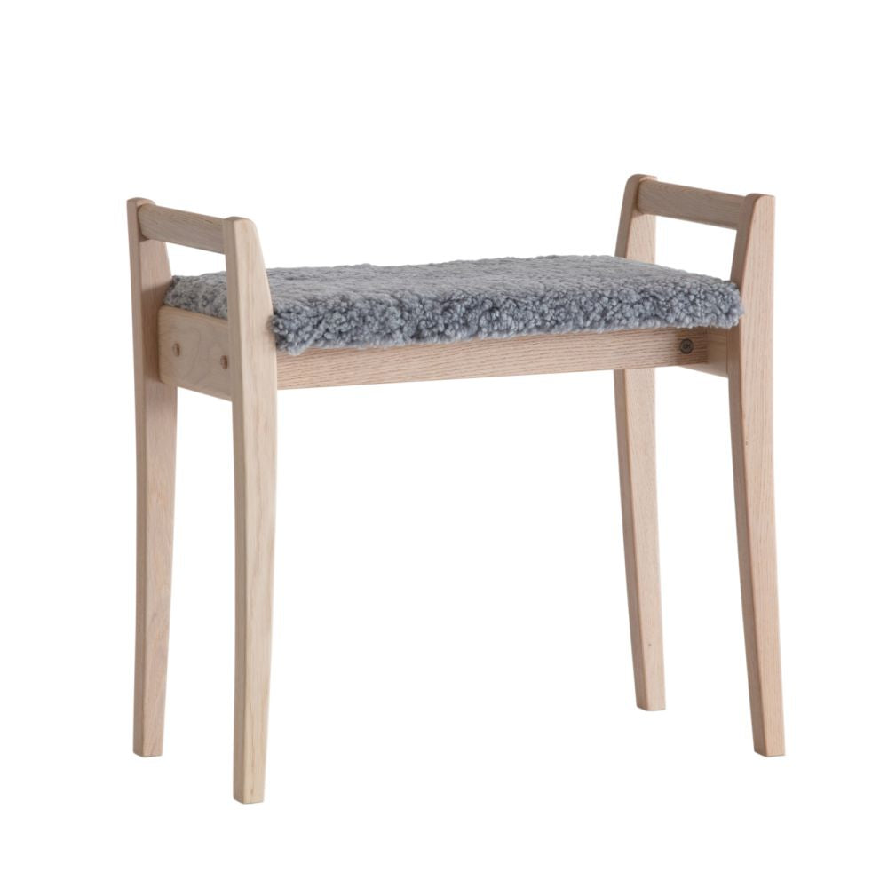 • Pall i ek med grå fårskinnsdyna, skandinavisk design med fyra ben och handtag