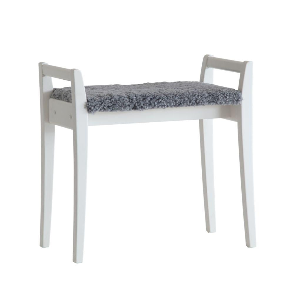 • Vit pall med grå fårskinnsdyna och fyra ben, skandinavisk design för sovrum eller hall