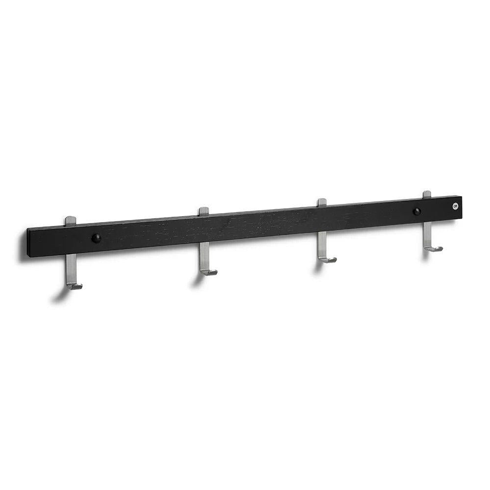 • Väggmonterad kroklist i svart trä med fyra silverfärgade krokar för förvaring