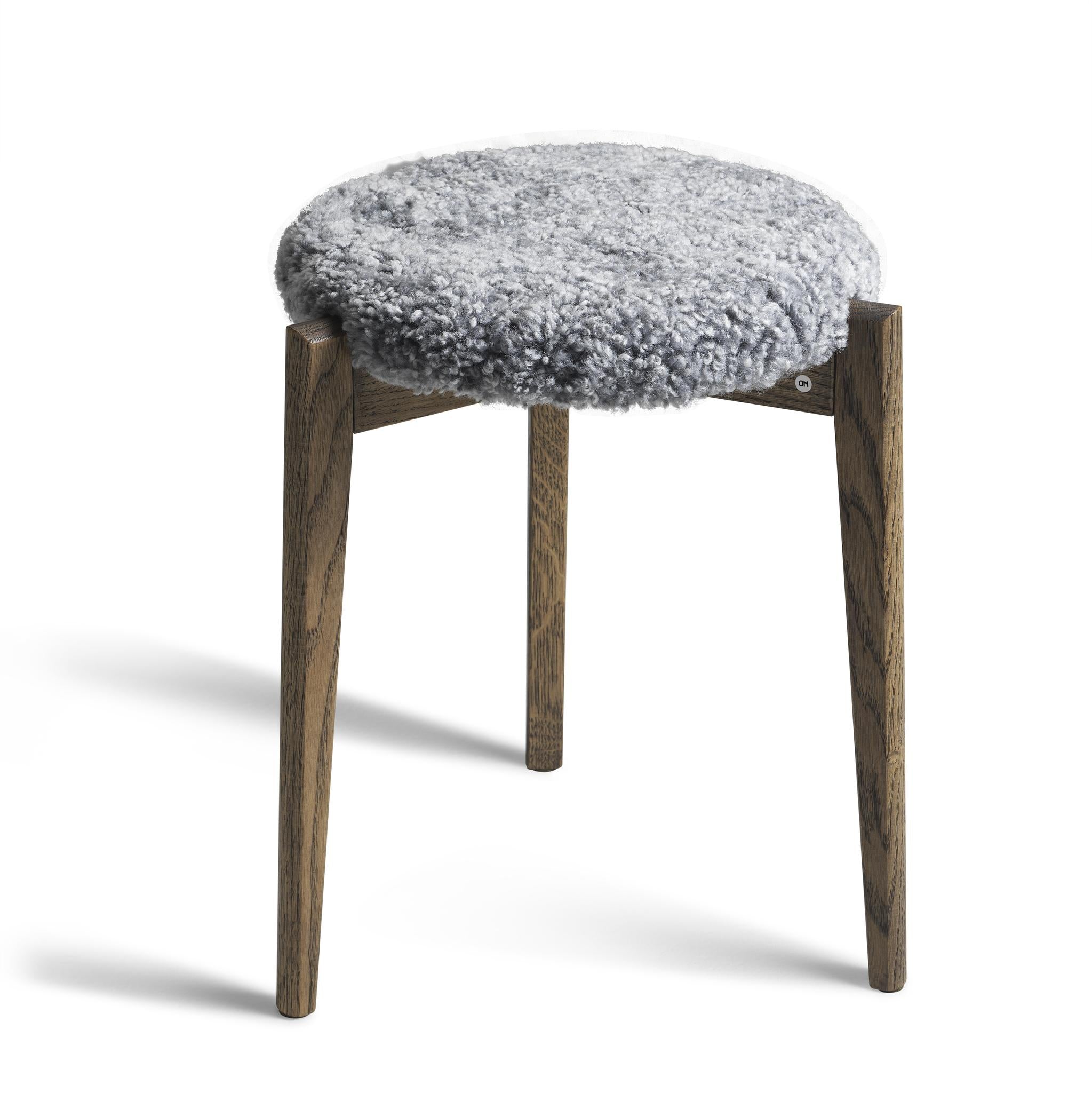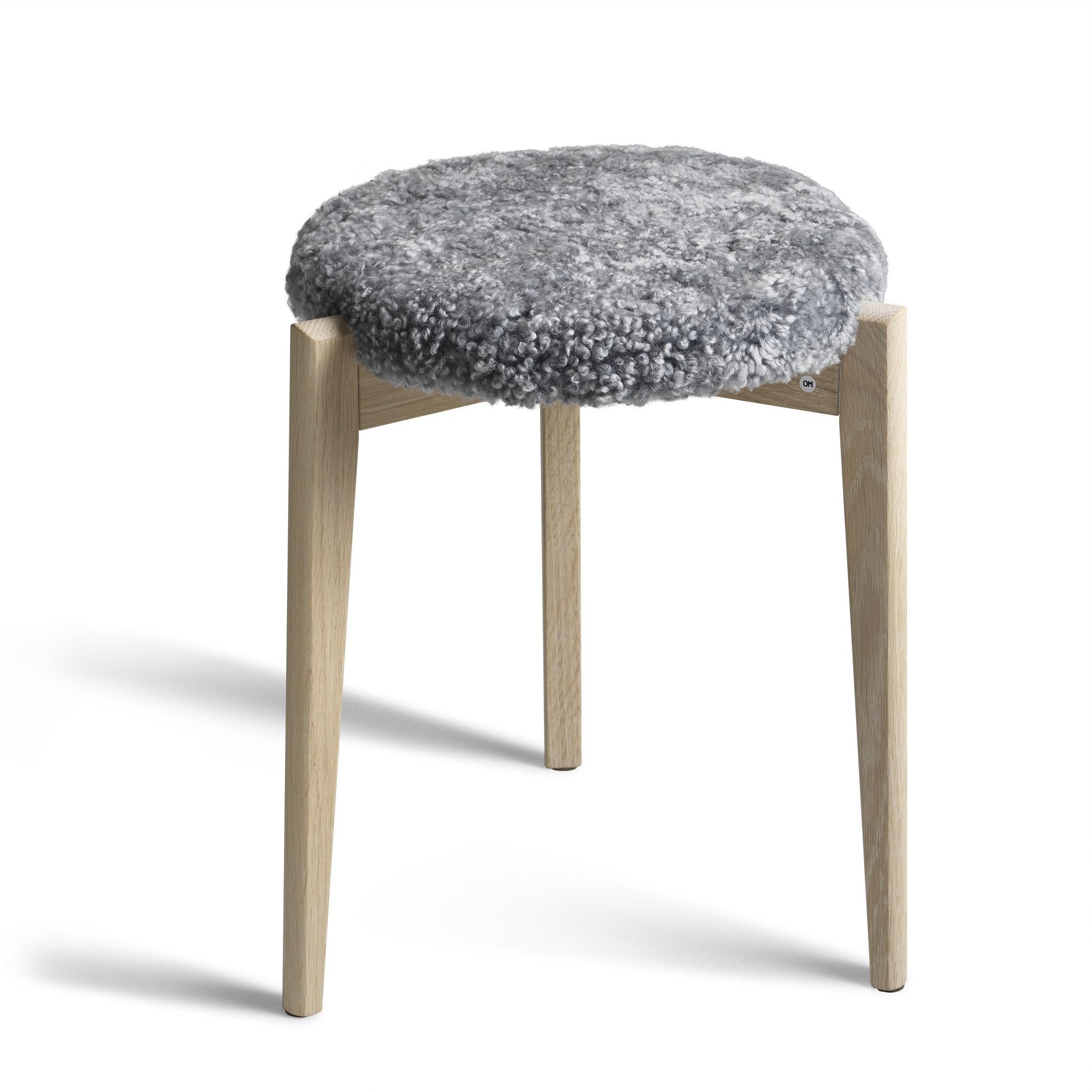 • Pall med grå fårskinnsdyna och ben i ek, rund sittmöbel i skandinavisk design