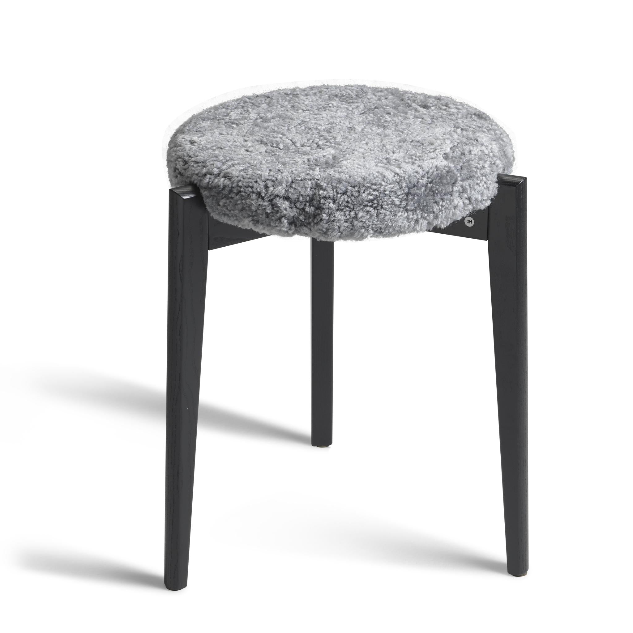 • Rund pall med grå fårskinnsdyna och svarta träben