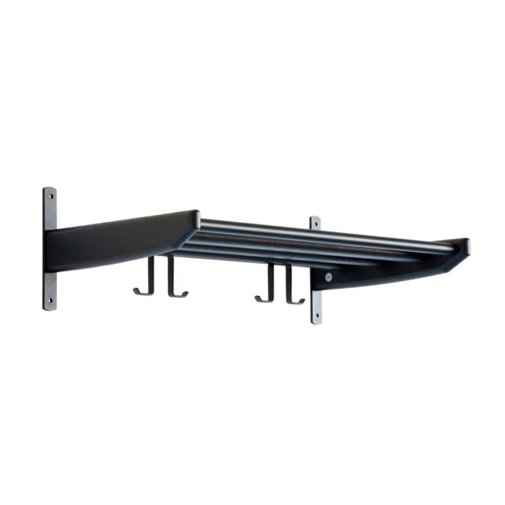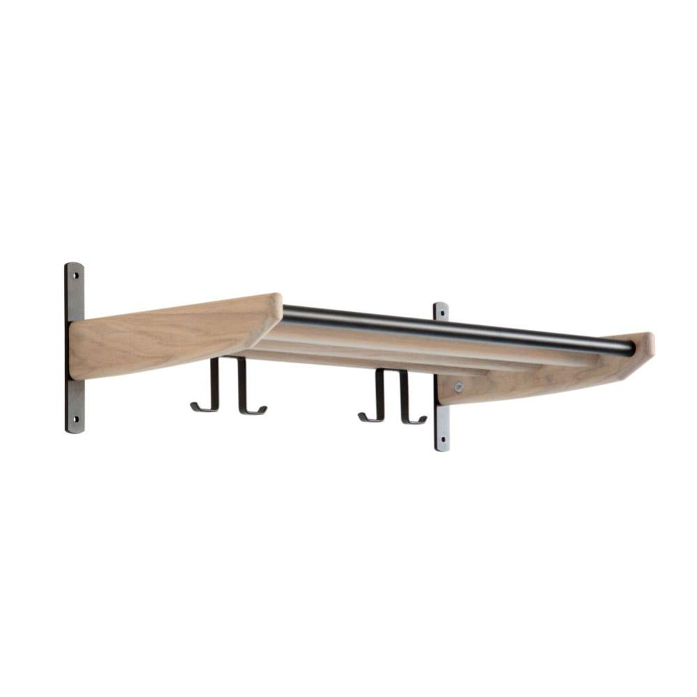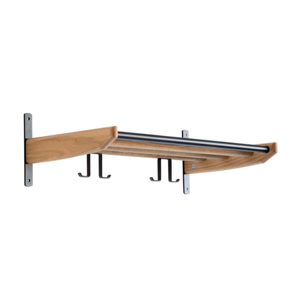 • Väggmonterad hattoch rockhylla i ek med metallkrokar och skofack i svart metall