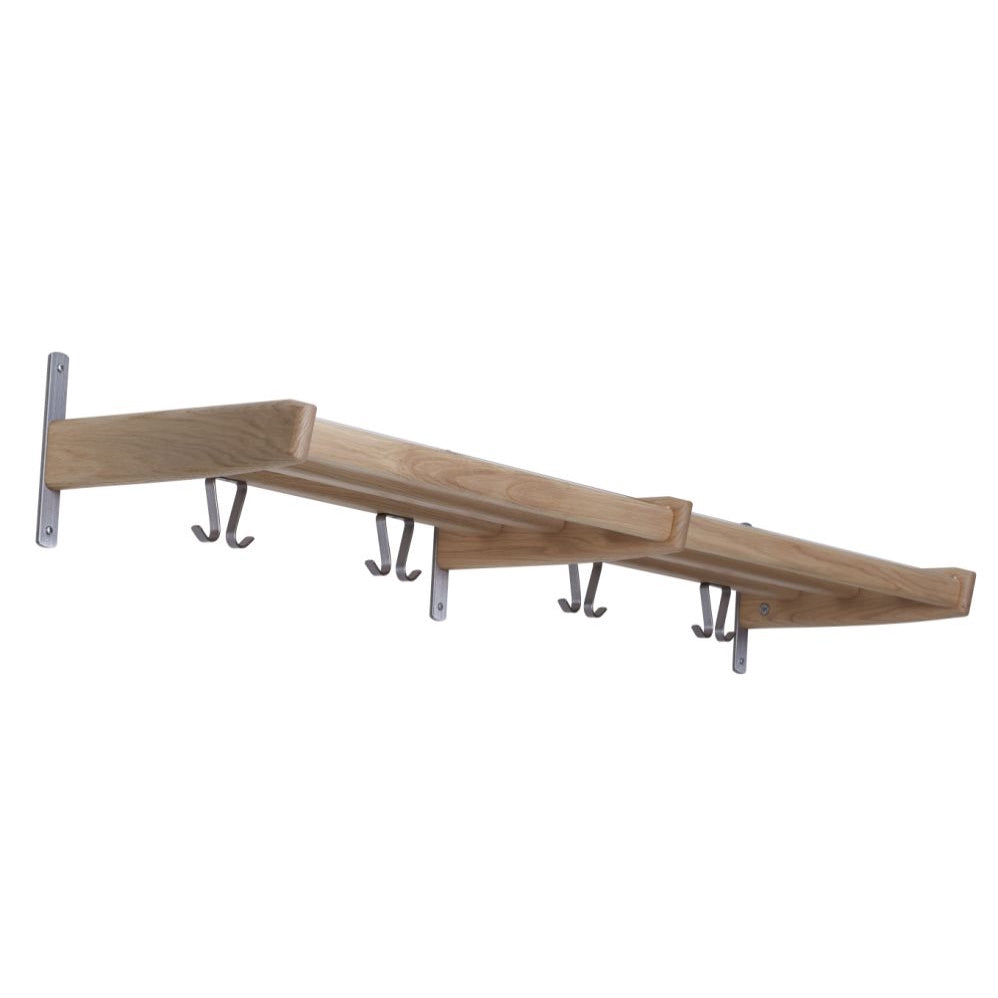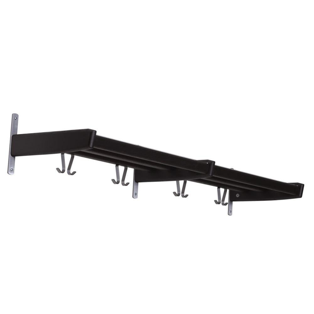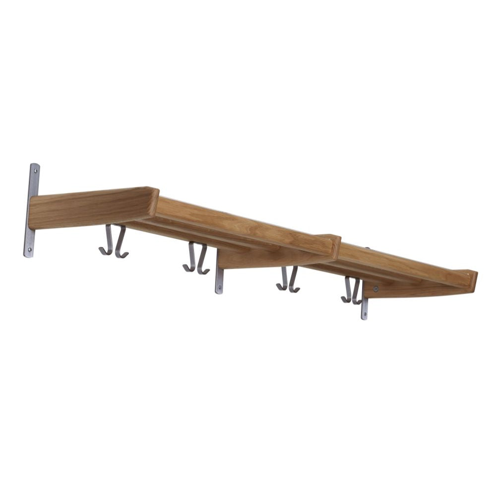 • Väggmonterad kappstång i trä med metallkrokar och hyllplan, rustikal design för hall eller kök