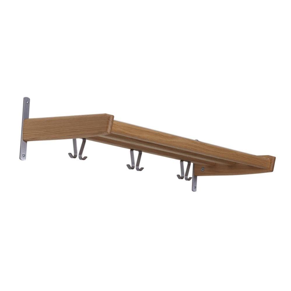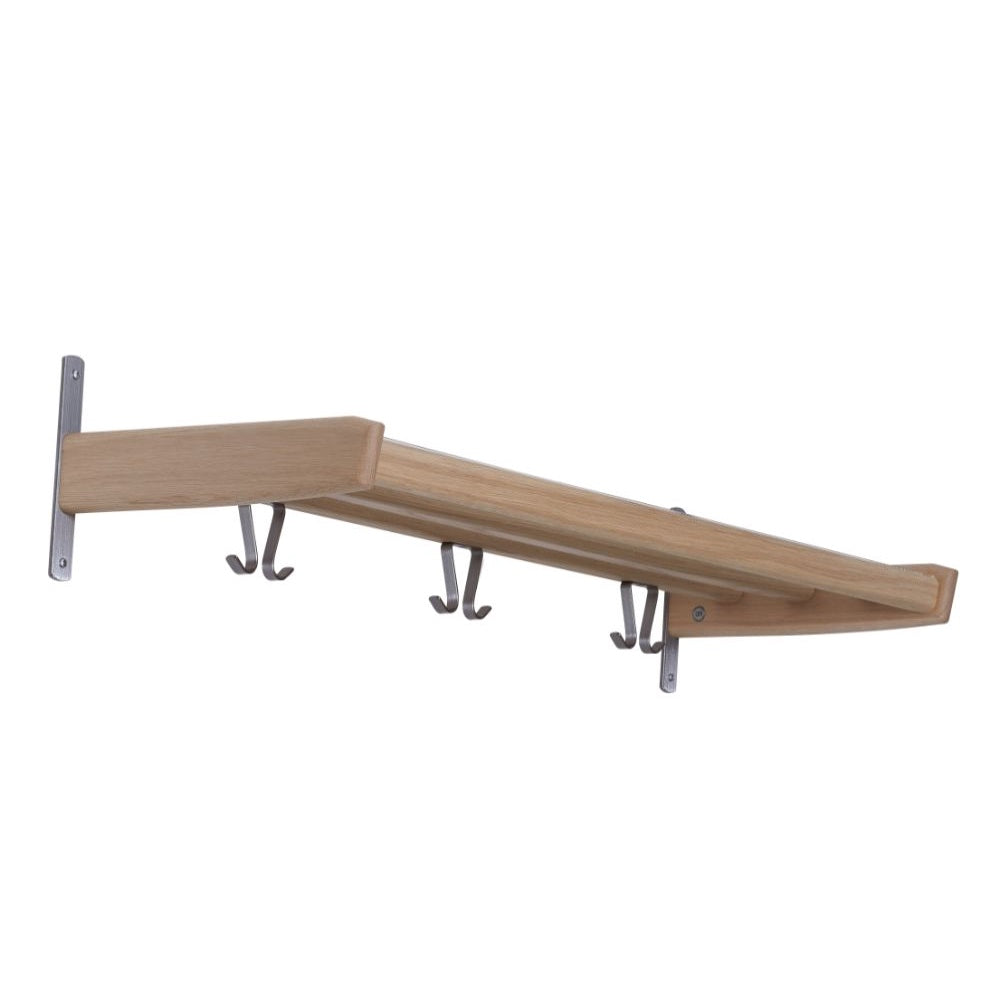 MEJA HATTHYLLA 1 PLAN Hatthylla med 1 hyllplan och detaljer i slipat stål. Hyllan finns i längden 59 cm, 90 cm och 115 cm. Hatthyllan är tillverkad i massiv ek eller vitlackad massiv björk. Hatthyllans galgstång har en infälld plexilist för att skydda träet mot slitage. Nu har vi designat en hallmöbel med en korsning av klassisk och nyskapande form. Vår styrka ligger i valen av material, vårt sinne för detaljer och vår passion för design. Hyllorna finns med både detaljer i slipat och i vitlackat stål. (Galge som visas på bilder ingår ej). Slipat stål
