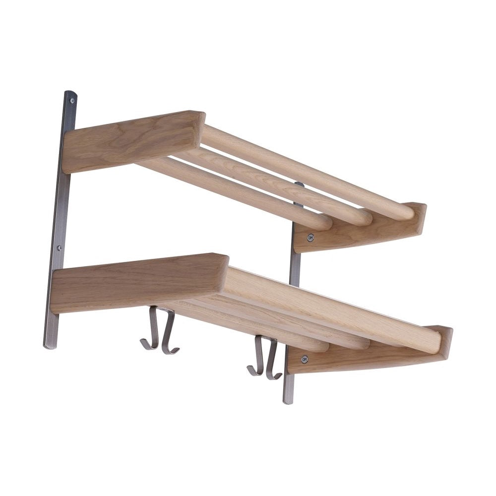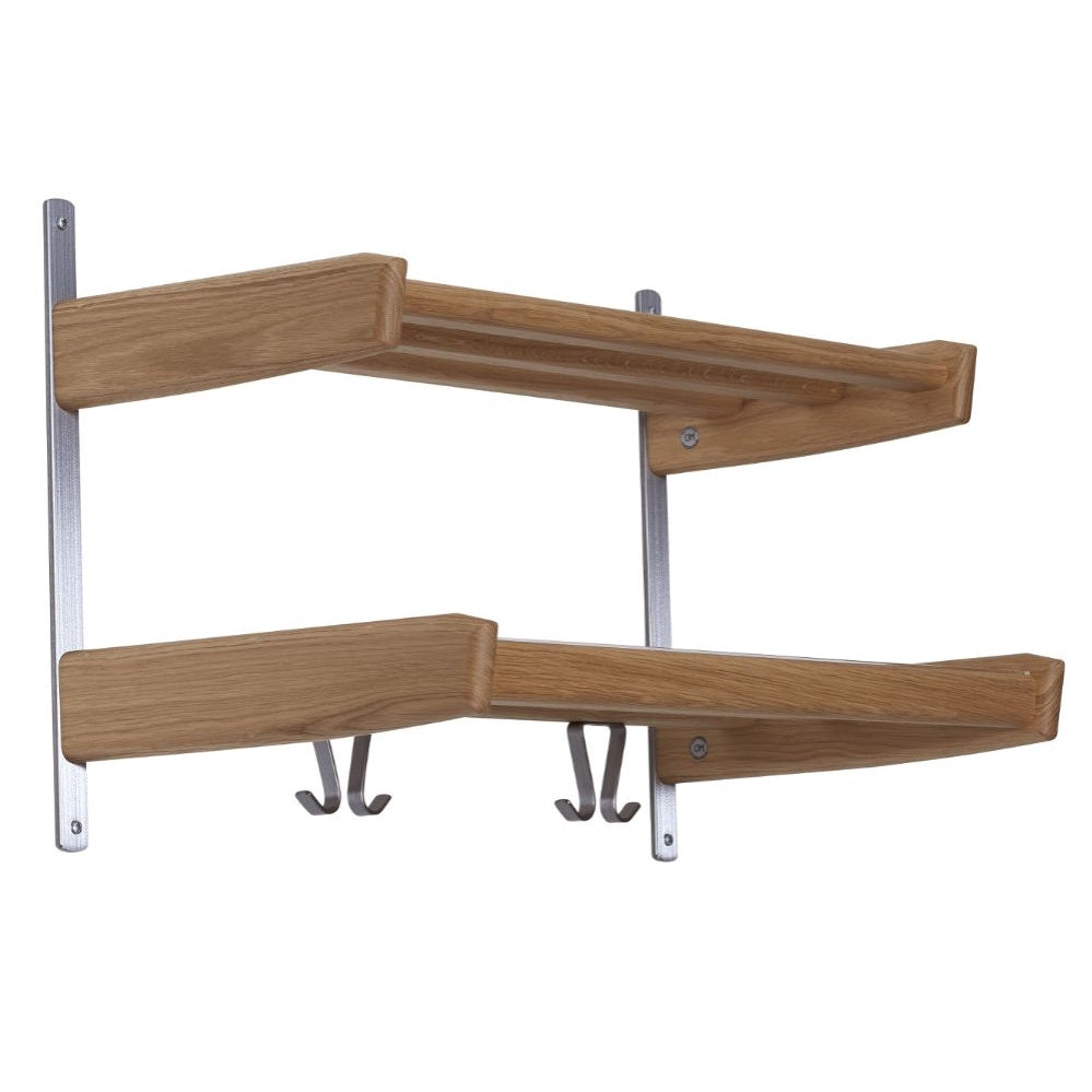 MEJA HATTHYLLA 2 PLAN Hatthylla med 2 hyllplan och detaljer i slipat stål. Hyllan finns i längden 59 cm, 90 cm och 115 cm. Hatthyllan är tillverkad i massiv ek eller vitlackad massiv björk. Hatthyllans galgstång har en infälld plexilist för att skydda träet mot slitage. Nu har vi designat en hallmöbel med en korsning av klassisk och nyskapande form. Vår styrka ligger i valen av material, vårt sinne för detaljer och vår passion för design. Hyllorna finns med både detaljer i slipat och i vitlackat stål. (Galge som visas på bilder ingår ej). Hatthyllans galgstång har en infälld plexilist för att skydda träet mot slitage. Slipat stål
