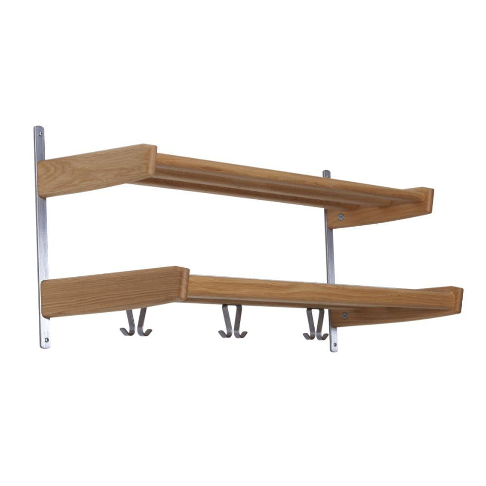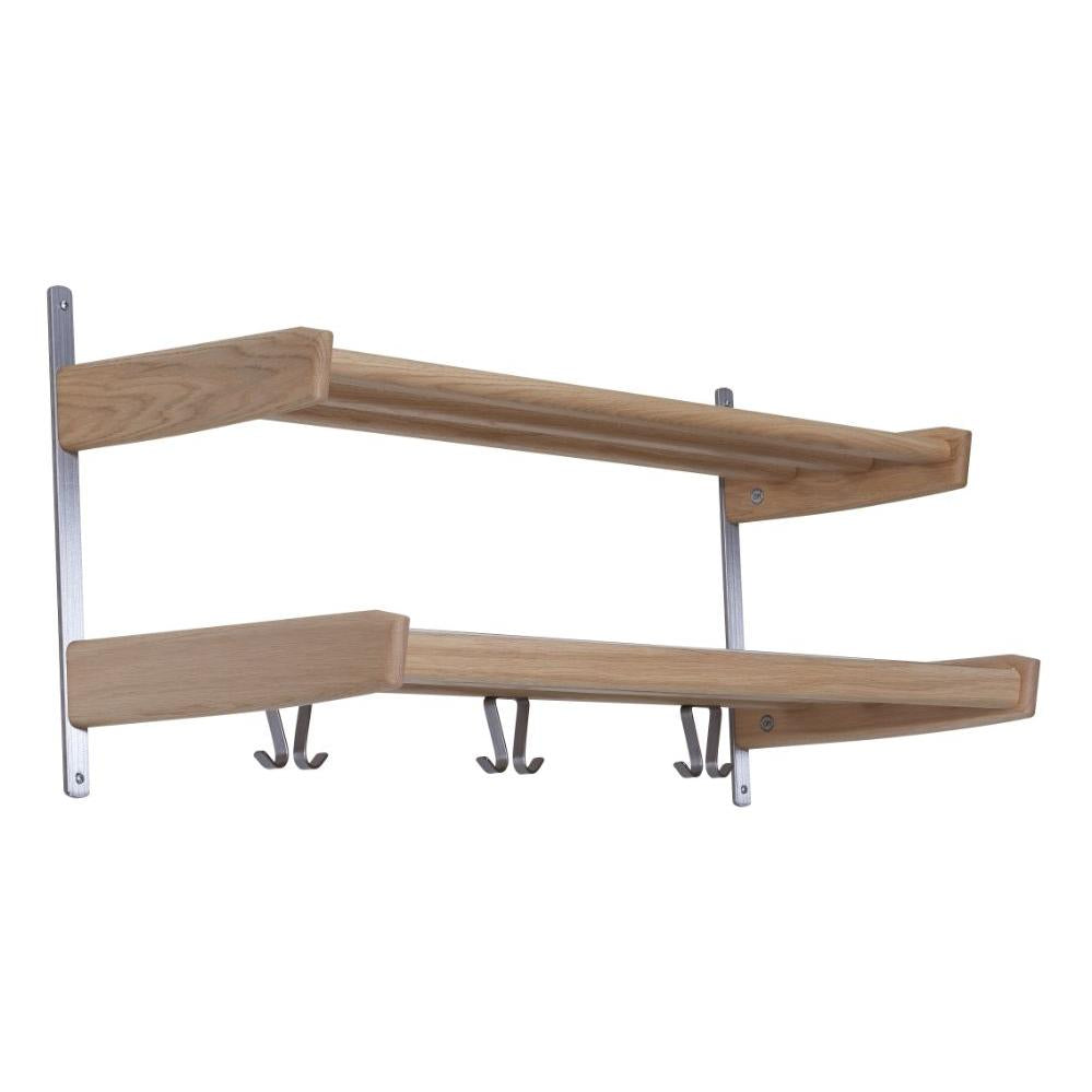 • Väggmonterad hattshylla i ek med dubbla hyllplan och krokar i metall