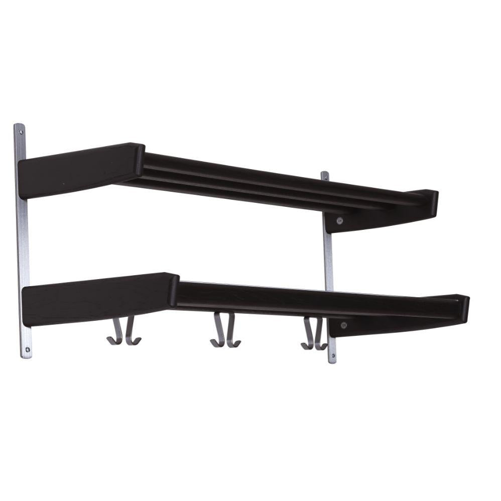 • Väggmonterad svart hattlista med två hyllplan och krokar i metall för förvaring av kläder och hattar